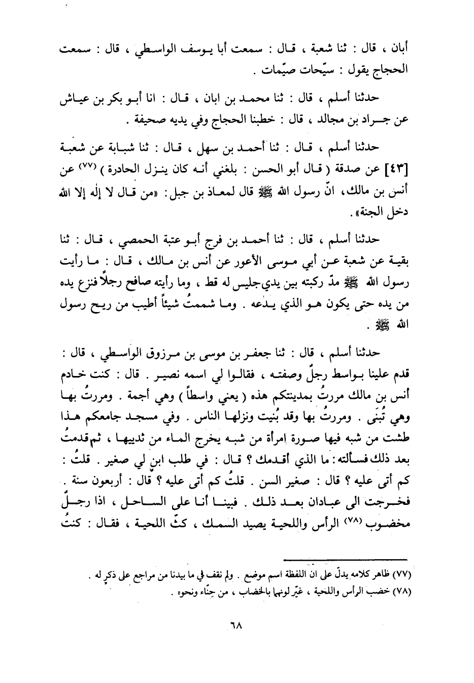 حدثنا أسلم، قَالَ: ثنا أَحْمَدُ بْنُ سَهْلٍ، قَالَ: ثنا شَبَابَةُ عَنْ شُعْبَةَ [43] عَنْ صَدَقَةَ (قَالَ أَبُو الْحَسَنِ: بَلَغَنِي أَنَّهُ كَانَ يَنْزِلُ الْحَادِرَةَ) «77» عَنْ أنس بن مالك، أن رسول الله صلى اللَّهُ عَلَيْهِ وَسَلَّمَ قَالَ لِمُعَاذِ بْنِ جَبَلٍ: «مَنْ قَالَ لا إِلَهَ إِلا اللَّهُ دَخَلَ الجنة» .