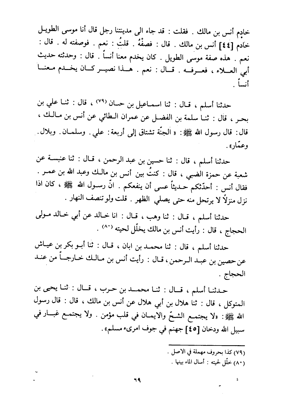 حدثنا أسلم، قال: ثنا اسماعيل بن ح؟؟؟ ان «79» ، قَالَ: ثنا عَلِيُّ بْنُ بَحْرٍ، قَالَ: ثنا سَلَمَةُ بْنُ الْفَضْلِ عَنْ عِمْرَانَ الطَّائِيِّ عَنْ أنس بن مالك، قال: قال رسول الله صَلَّى اللَّهُ عَلَيْهِ وَسَلَّمَ: «الْجَنَّةُ تَشْتَاقُ إِلَى أربعة: علي. وسلمان. وبلال.
