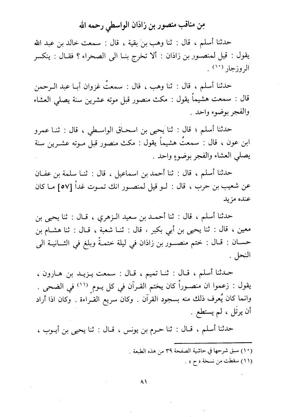 حدثنا أسلم، قال: ثنا أحمد بن سعيد الزهري، قال: ثنا يَحْيَى بْنُ مَعِينٍ، قَالَ: ثنا يَحْيَى بن أبي بكير، قال: ثنا شعبة، قال: ثنا هِشَامُ بْنُ حَسَّانٍ: قَالَ: خَتَمَ مَنْصُورُ بْنُ زَاذَانَ فِي لَيْلَةٍ خَتْمَةً وَبَلَغَ فِي الثانية الى النحل.