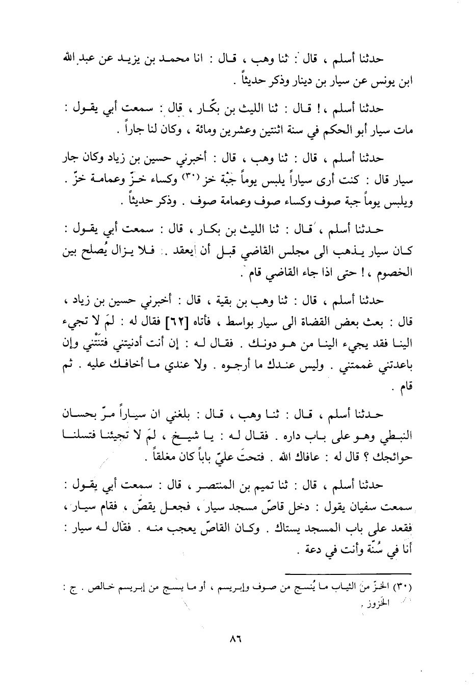 حدثنا أسلم، قَالَ: ثنا وهب، قَالَ: أخبرني حسين بن زياد وكان جار سيار قَالَ: كنت أرى سيارا يلبس يوما جبة خز «30» وكساء خز وعمامة خز.