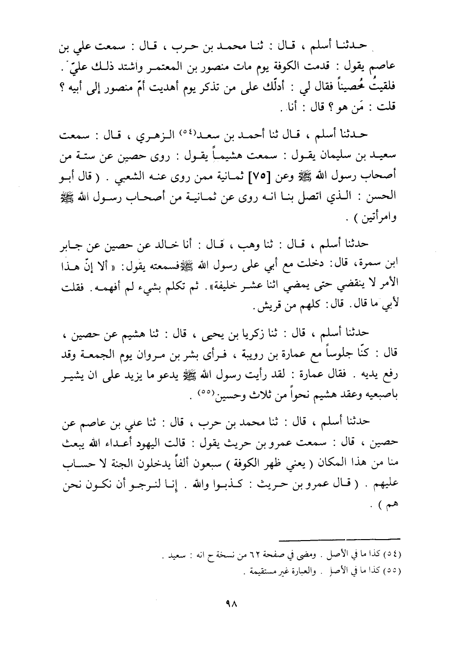 حدثنا أسلم، قَالَ ثنا أَحْمَد بن سعد «54» الزهري، قَالَ: سمعت سعيد بن سليمان يقول: سمعت هشيما يقول: روى حصين عن ستة من أصحاب رسول الله صلى الله عليه وسلم وعن [75] ثمانية ممن روى عنه الشعبي. (قَالَ أبو الحسن: الذي اتصل بنا أنه روى عن ثمانية من أصحاب رَسُول اللَّهِ صَلَّى اللَّهُ عليه وسلم وامرأتين) .
