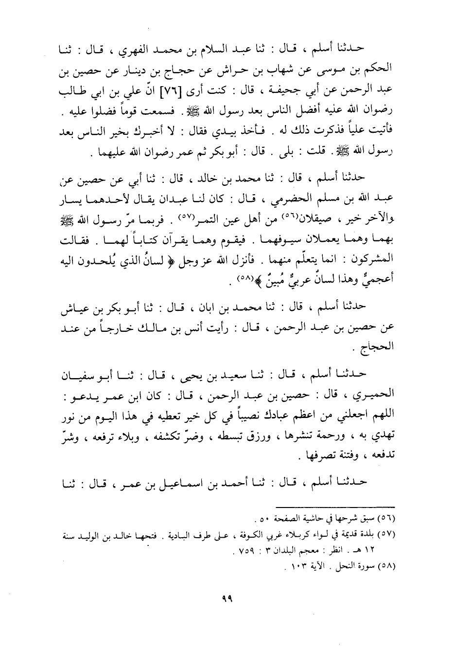حدثنا أسلم، قَالَ: ثنا مُحَمَّدُ بْنُ خَالِدٍ، قَالَ: ثنا أَبِي عَنْ حُصَيْنٍ عَنْ عَبْدِ اللَّهِ بْنِ مُسْلِمٍ الْحَضْرَمِيِّ، قَالَ: كَانَ لَنَا عَبْدَانِ يُقَالُ لأَحَدِهِمَا يَسَارٌ وَالآخَرُ خَيْرٌ، صَيْقَلانَ «56» مِنْ أَهْلِ عَيْنِ التَّمْرِ «57» . فَرُبَّمَا مَرَّ رَسُولُ اللَّهِ صَلَّى اللَّهُ عَلَيْهِ وَسَلَّمَ بِهِمَا وَهُمَا يَعْمَلانِ سُيُوفَهُمَا. فيقوم وهما يقرآن كِتَابًا لَهُمَا. فَقَالَتِ الْمُشْرِكُونَ: إِنَّمَا يَتَعَلَّمُ مِنْهُمَا. فَأَنْزَلَ اللَّهُ عَزَّ وَجَلَّ لِسانُ الَّذِي يُلْحِدُونَ إِلَيْهِ أَعْجَمِيٌّ وَهذا لِسانٌ عَرَبِيٌّ مُبِينٌ