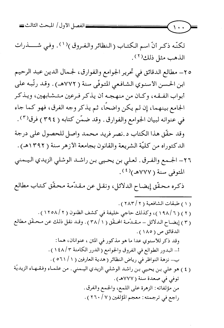 ٢٥ - مطالع الدقائق في تحرير الجوامع والفوارق، لجمال الدين عبد الرحيم ابن الحسن الأسنوي الشافعي المتوفي سنة (٧٧٢ هـ). وقد رتبه على أبواب الفقه، وكان من منهجه أن يذكر فرعين متشابهين، ويذكر الجامع بينهما، إن لم يكن واضحاً، ثم يذكر وجه الفرق، فهو كما جاء في عنوان لبيان الجوامع والفوارق. وقد ضمّن كتابه (٣٩٤) فرق (٣).