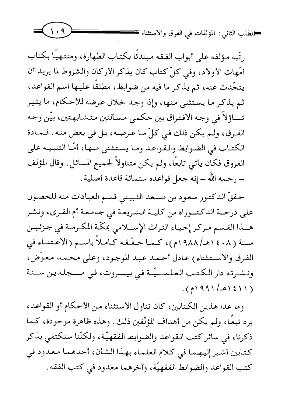 وما عدا هذين الكتابين، كان تناول الاستثناء من الأحكام أو القواعد، يرد تبعاً، ولم يكن من أهداف المؤلفين ذلك. وهذه ظاهرة موجودة، كما ذكرنا، في سائر كتب القواعد والضوابط الفقهية، ولكننا سنكتفي بذكر كتابين أشير إليهما في كلام العلماء بهذا الشأن، أحدهما معدود في كتب القواعد والضوابط الفقهية، وآخرهما معدود في كتب الفقه.