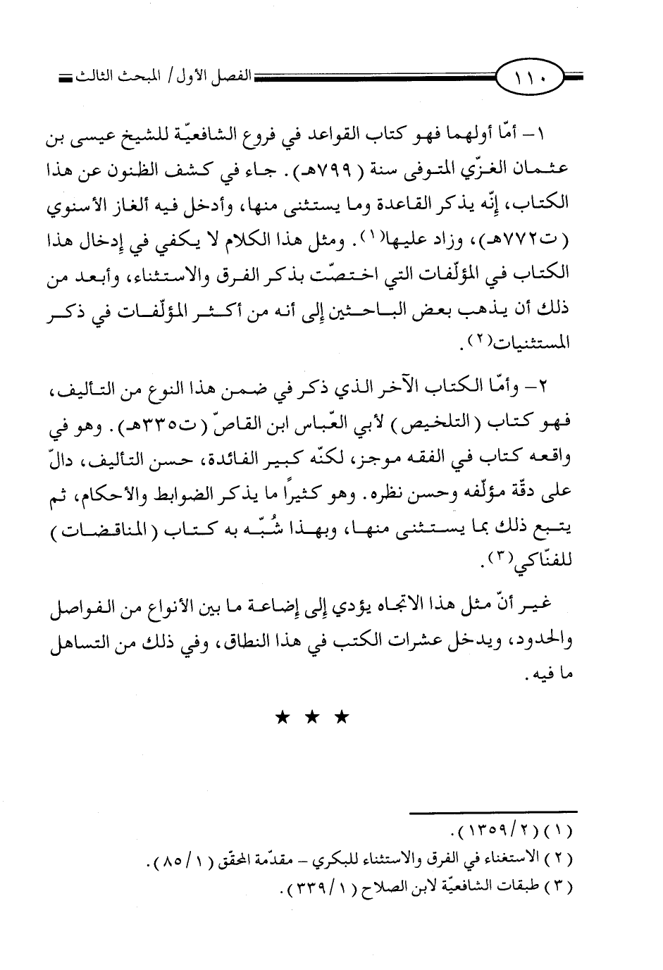 ١ - أما أولهما فهو كتاب القواعد في فروع الشافعية للشيخ عيسى بن عثمان الغزي المتوفي سنة (٧٩٩ هـ). جاء في كشف الظنون عن هذا الكتاب، إنه يذكر القاعدة وما يستثنى منها، وأدخل فيها ألغاز الأسنوي (ت ٧٧٢ هـ)، وزاد عليها (١). ومثل هذا الكلام لا يكفي في إدخال هذا الكتاب في المؤلفات التي اختصت بذكر الفرق والاستثناء، وأبعد من ذلك أن يذهب بعض الباحثين إلى أنه من أكثر المؤلفات في ذكر المستثنيات (٢).