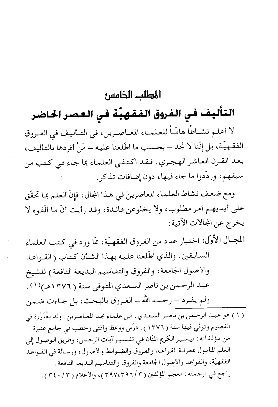 المجال الأول: اختيار عدد من الفروق الفقهية، مما ورد في كتب العلماء السابقين. والذي اطلعنا عليه بهذا الشأن كتاب (القواعد والأصول الجامعة، والفروق والتقاسيم البديعة النافعة) للشيخ عبد الرحمن بن ناصر السعدي المتوفي سنة (١٣٧٦ هـ) (١). ولم يفرد- رحمه الله- الفروق بالبحث، بل جاءت ضمن