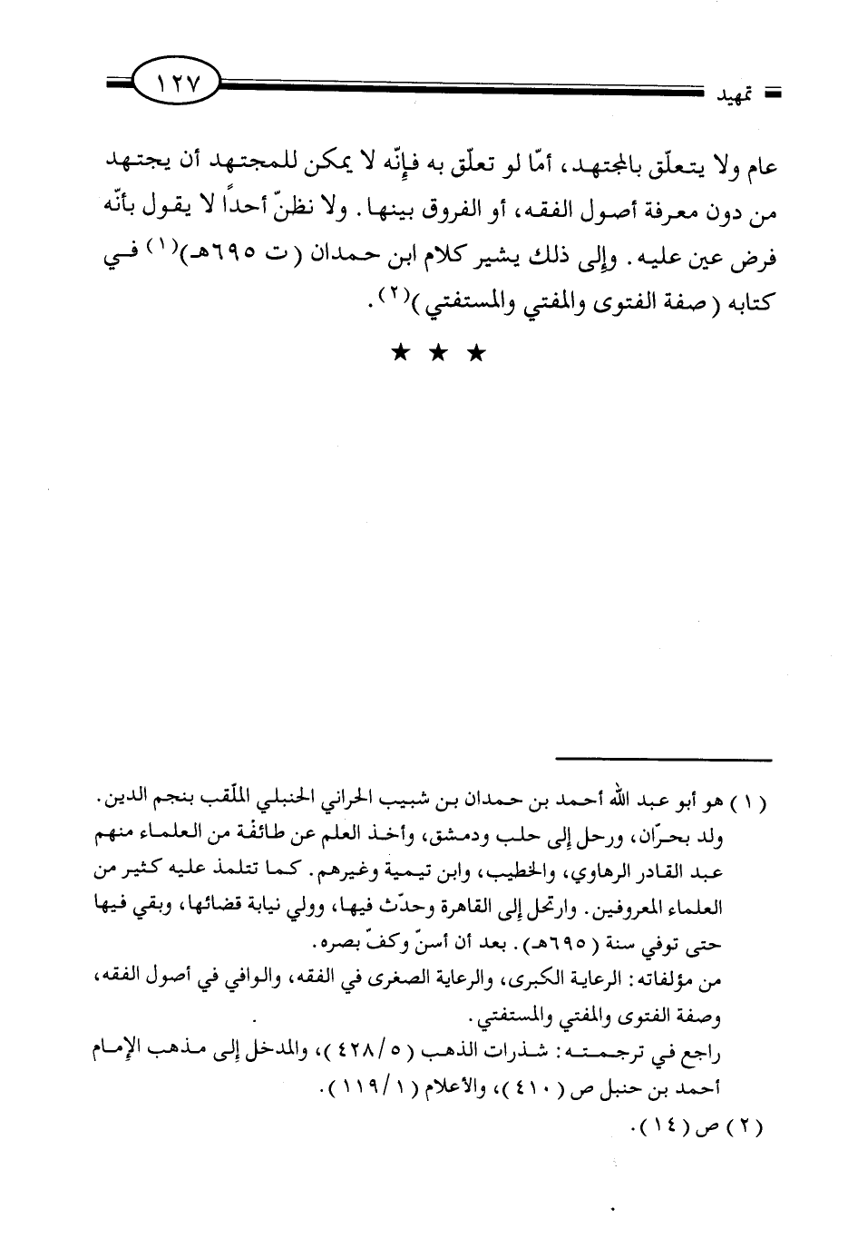 (١) هو أبو عبد الله أحمد بن حمدان بن شبيب الحراني الحنبلي الملقب بنجم الدين. ولد بحرّان، ورحل إلى حلب ودمشق، وأخذ العلم عن طائفة من العلماء منهم عبد القادر الرهاوي، والخطيب، وابن تيمية وغيرهم. كما تتلمذ عليه كثير من العلماء المعروفين. وارتحل إلى القاهرة وحدّث فيها، وولي نيابة قضائها، وبقي فيها حتى توفي سنة (٦٩٥ هـ). بعد أن أسنّ وكفّ بصره.