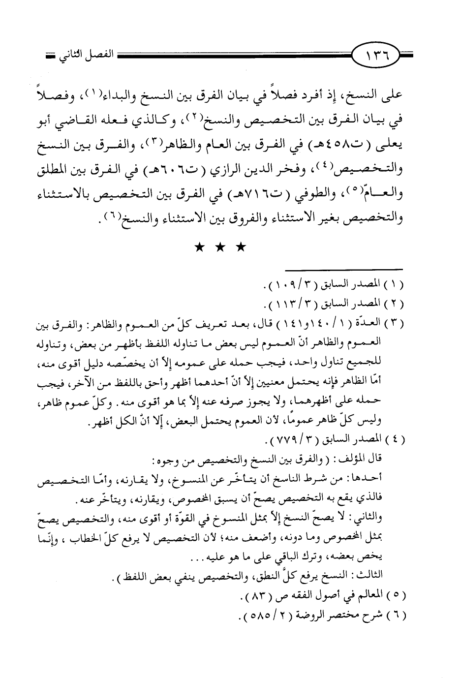 على النسخ، إذ أفرد فصلاً في بيان الفرق بين النسخ والبداء (١)، وفصلاً في بيان الفرق بين التخصيص والنسخ (٢)، وكالذي فعله القاضي أبو يعلى (ت ٤٥٨ هـ) في الفرق بين العام والظاهر (٣)، والفرق بين النسخ والتخصيص (٤)، وفخر الدين الرازي (ت ٦٠٦ هـ) في الفرق بين المطلق والعام (٥)، والطوفي (ت ٧١٦ هـ) في الفرق بين التخصيص بالاستثناء والتخصيص بغير الاستثناء والفروق بين الاستثناء والنسخ (٦).