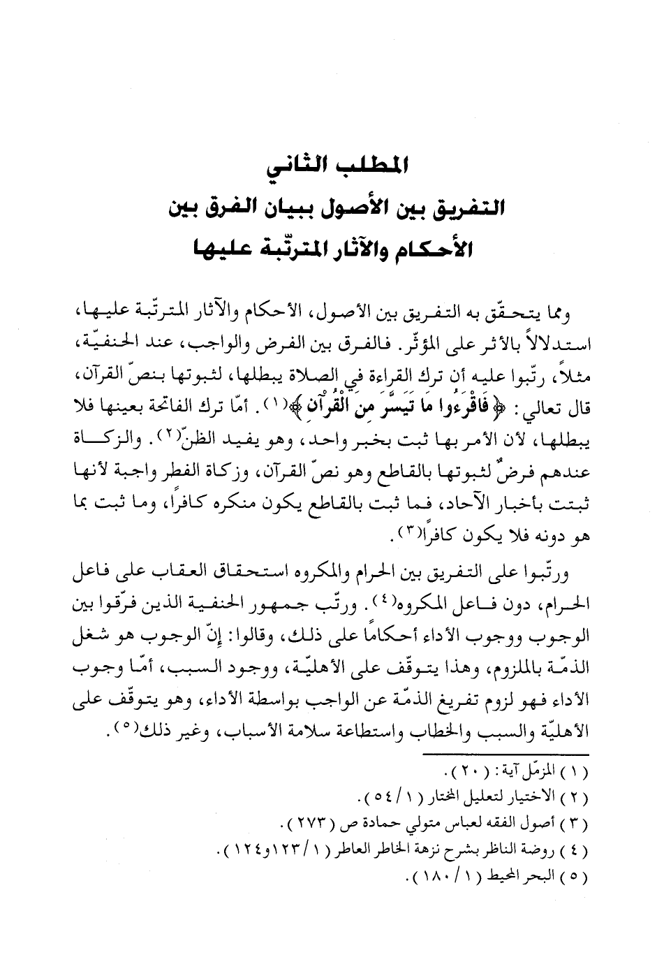 ومما يتحقق به التفريق بين الأصول، الأحكام والآثار المترتبة عليها، استدلالاً بالأثر على المؤثر. فالفرق بين الفرض والواجب، عند الحنفية، مثلاً، رتبوا عليه أن ترك القراءة في الصلاة يبطلها، لثبوتها بنص القرآن، قال تعالى: (فَاقْرَءُوا مَا تَيَسَّرَ مِنَ الْقُرْآَنِ) (١). أما ترك الفاتحة بعينها فلا يبطلها، لأن الأمر بها ثبت بخبر واحد، وهو يفيد الظن (٢). والزكاة عندهم فرضٌ لثبوتها بالقاطع وهو نص القرآن، وزكاة الفطر واجبة لأنها ثبتت بأخبار الآحاد، فما ثبت بالقاطع يكون منكره كافراً، وما ثبت بما هو دونه فلا يكون كافراً (٣).