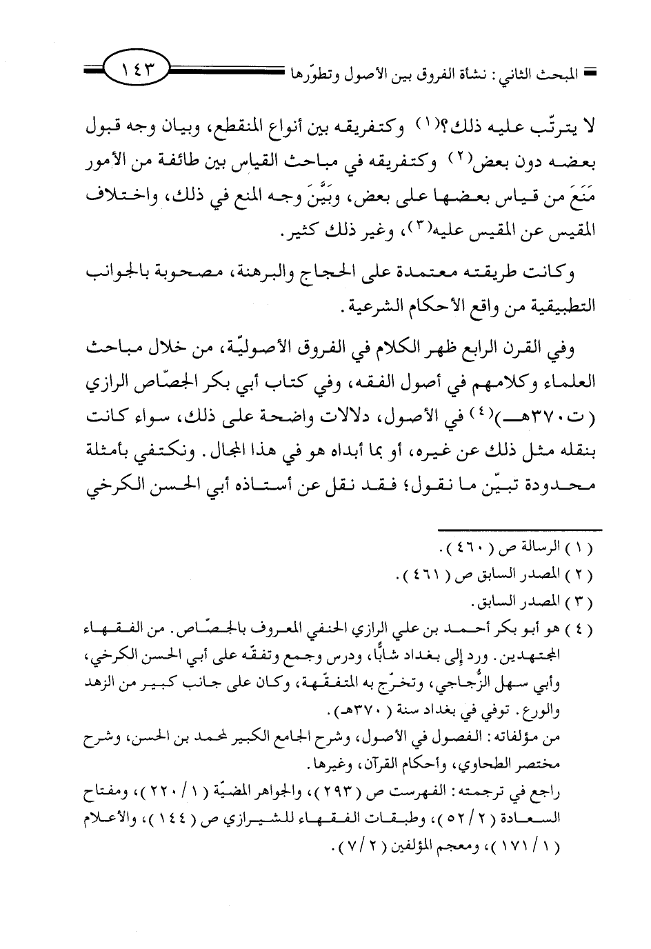وفي القرن الرابع ظهر الكلام في الفروق الأصولية، من خلال مباحث العلماء وكلامهم في أصول الفقه، وفي كتاب أبي بكر الجصاص الرازي (ت ٣٧٠ هـ) (٤) في الأصول، دلالات واضحة على ذلك، سواء كانت بنقله مثل ذلك عن غيره، أو بما أبداه هو في هذا المجال. ونكتفي بأمثلة محدودة تبين ما نقول؛ فقد نقل عن أستاذه أبي الحسن الكرخي