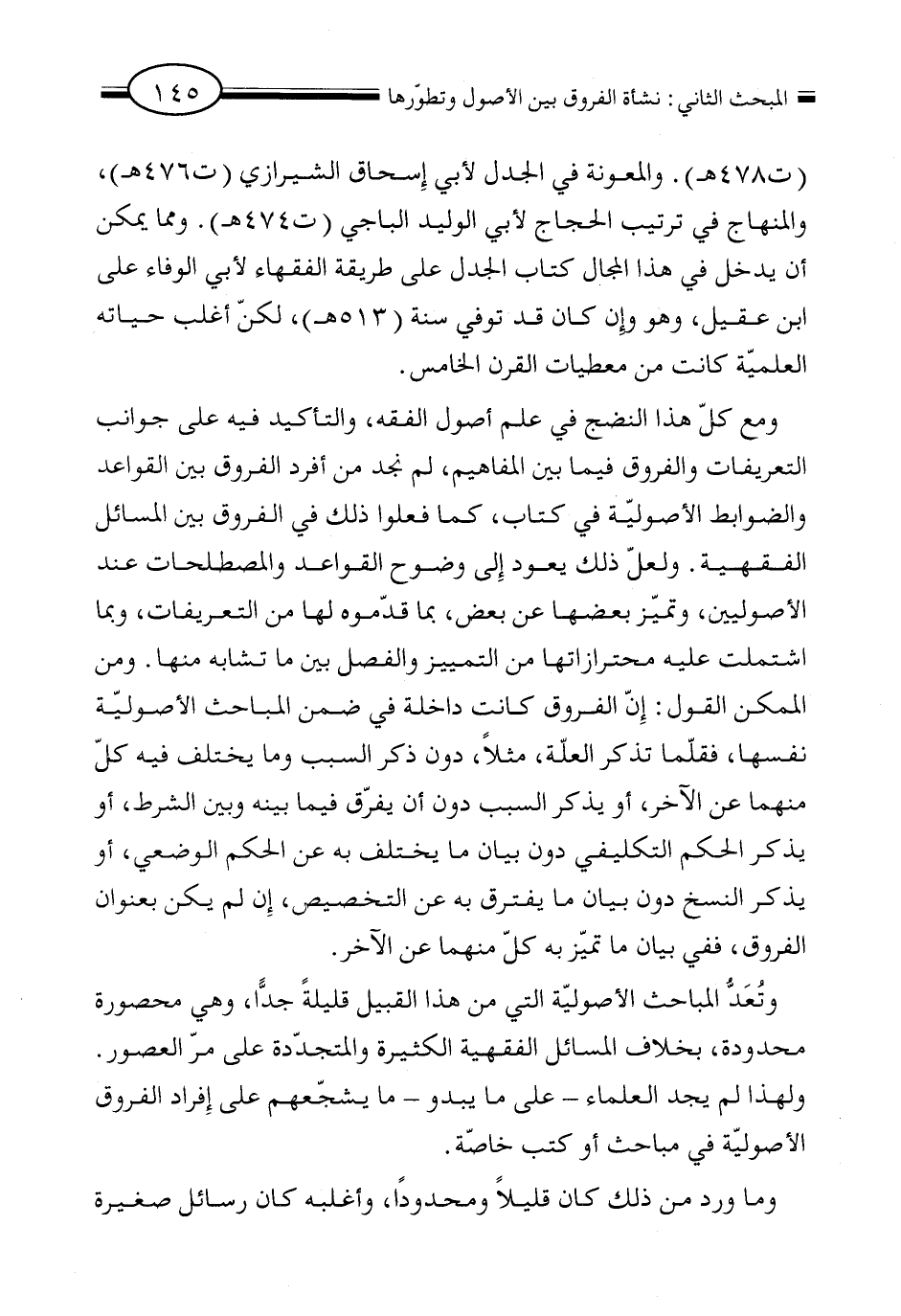 (ت ٤٧٨ هـ). والمعونة في الجدل لأبي إسحاق الشيرازي (ت ٤٧٦ هـ)، والمنهاج في ترتيب الحجاج لأبي الوليد الباجي (ت ٤٧٤ هـ). ومما يمكن أن يدخل في هذا المجال كتاب الجدل على طريقة الفقهاء لأبي الوفاء على ابن عقيل، وهو وإن كان قد توفي سنة (٥١٣ هـ)، لكن أغلب حياته العلمية كانت من معطيات القرن الخامس.