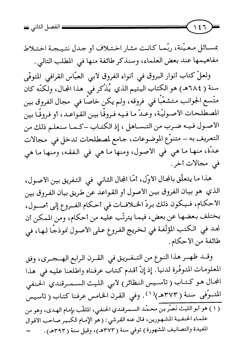 ولعل كتاب أنوار البروق في أنواء الفروق لأبي العباس القرافي المتوفي سنة (٦٨٤ هـ) هو الكتاب اليتيم الذي يُذْكر في هذا المجال، ولكنه كان متسع الجوانب متشعباً في فروقه، ولم يكن خاصاً في مجال الفروق بين المصطلحات الأصولية، وعدّ ما فيه فروقاً بين القواعد، أو فروقاً بين الأصول فيه ضرب من التساهل، إذ الكتاب – كما سنعلم ذلك من التعريف به- متنوع الموضوعات، جامع لمصطلحات تدخل في مجالات عدة، منها ما هي في الأصول، ومنها ما هي في الفقه، ومنها ما هي في مجالات أخر.