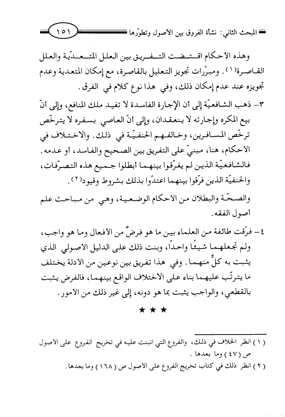 ٣ - ذهب الشافعية إلى أن الإجارة الفاسدة لا تفيد ملك المنافع، وإلى أن بيع المكره وإجارته لا ينعقدان، وإلى أن العاصي بسفره لا يترخص ترخص المسافرين، وخالفهم الحنفية في ذل. والاختلاف في الأحكام، هنا، مبنيّ على التفريق بين الصحيح والفاسد، أو عدمه. فالشافعية الذين لم يفرقوا بينهما أبطلوا جميع هذه التصرفات، والحنفية الذين فرقوا بينهما اعتدوا بذلك بشروط وقيود (٢).