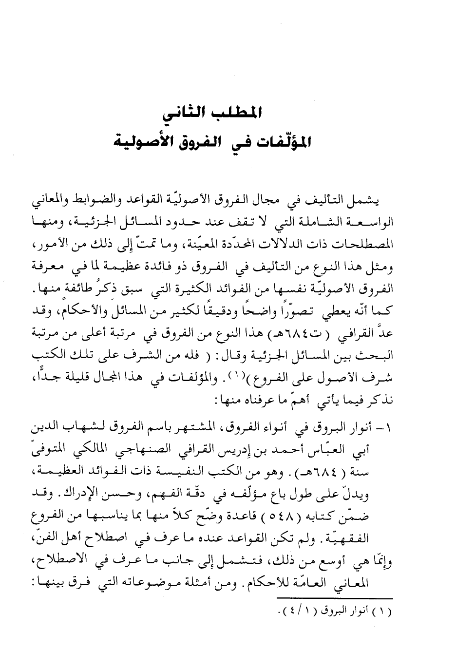 ١ - أنوار البروق في أنواء الفروق، المشتهر باسم الفروق لشهاب الدين أبي العباس أحمد بن إدريس القرافي الصنهاجي المالكي المتوفي سنة (٦٨٤ هـ). وهو من الكتب النفيسة ذات الفوائد العظيمة، ويدل على طول باع مؤلفه في دقة الفهم، وحسن الإدراك. وقد ضمّن كتابه (٥٤٨) قاعدة وضح كلاً منها بما يناسبها من الفروع الفقهية. ولم تكن القواعد عنده ما عرف في اصطلاح أهل الفن، وإنما هي أوسع من ذلك، فتشمل إلى جانب ما عرف في الاصطلاح، المعاني العامة للأحكام. ومن أمثلة موضوعاته التي فرق بينها: