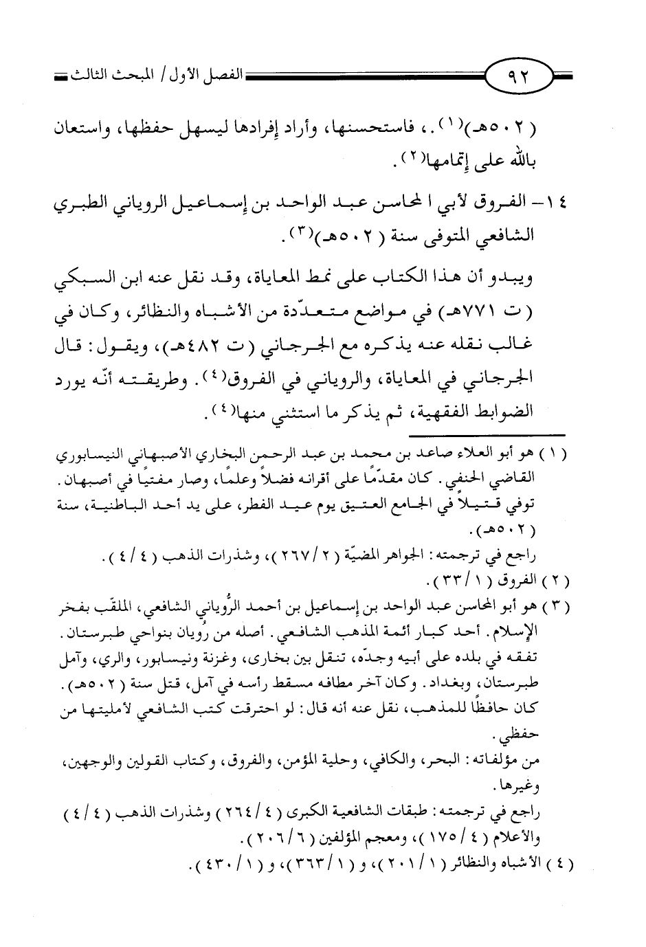 (٣) هو أبو المحاسن عبد الواحد بن إسماعيل بن أحمد الروياني الشافعي، الملقب بفخر الإسلام. أحد كبار أئمة المذهب الشافعي. أصله من رُويان بنواحي طبرستان. تفقه في بلده على أبيه وجده، تنقل بين بخاري، وغزنة ونيسابور، والري، وآمل طبرستان، وبغداد. وكان آخر مطافه مسقط رأسه في آمل، قتل سنة (٥٠٢ هـ). كان حافظاً للمذهب، نقل عنه أنه قال: لو احترقت كتب الشافعي لأمليتها من حفظي.