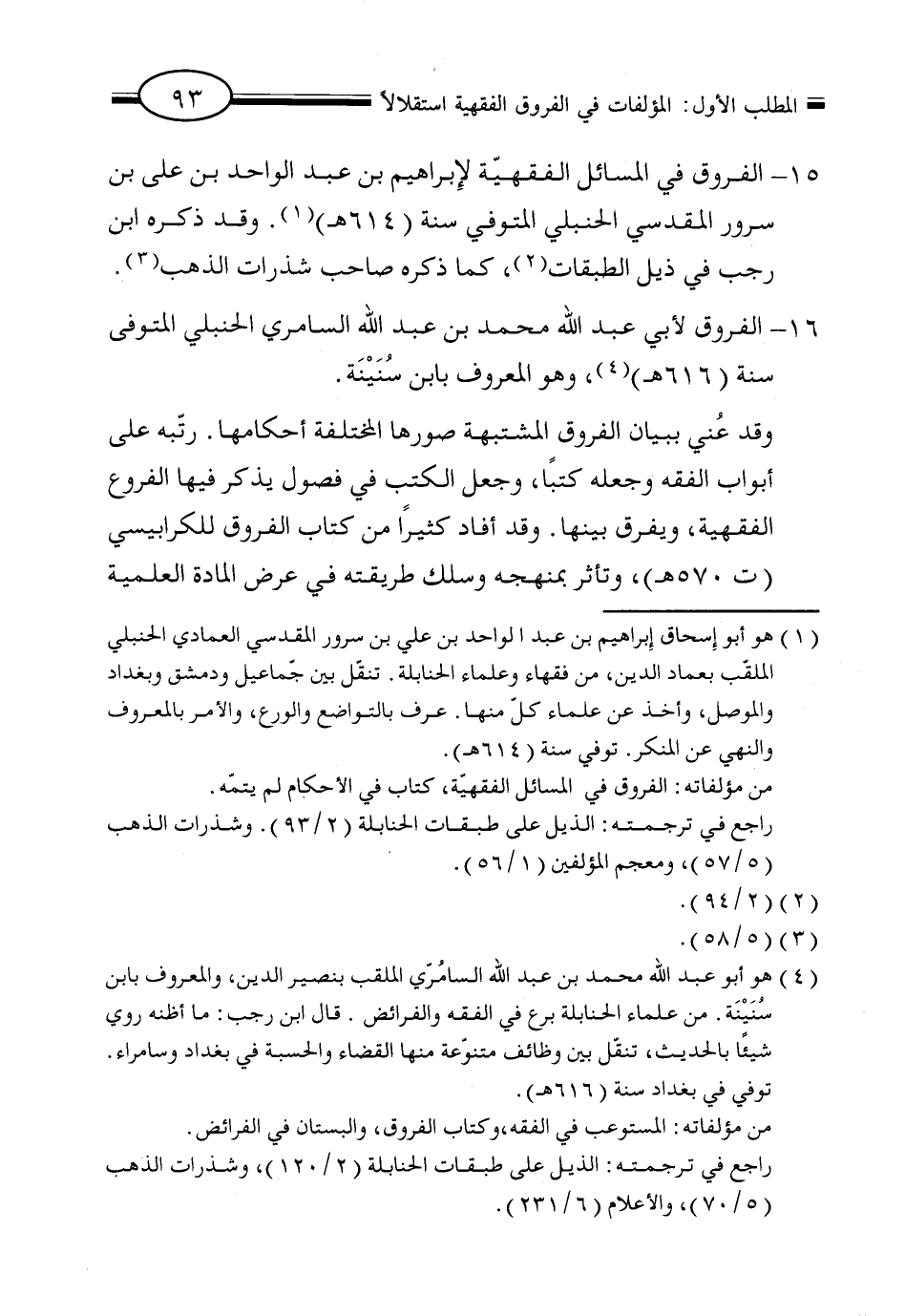 ١٥ - الفروق في المسائل الفقهية لإبراهيم بن عبد الواحد بن علي بن سرور المقدسي الحنبلي المتوفي سنة (٦١٤ هـ) (١). وقد ذكره ابن رجب في ذيل الطبقات (٢)، كما ذكره صاحب شذرات الذهب (٣).