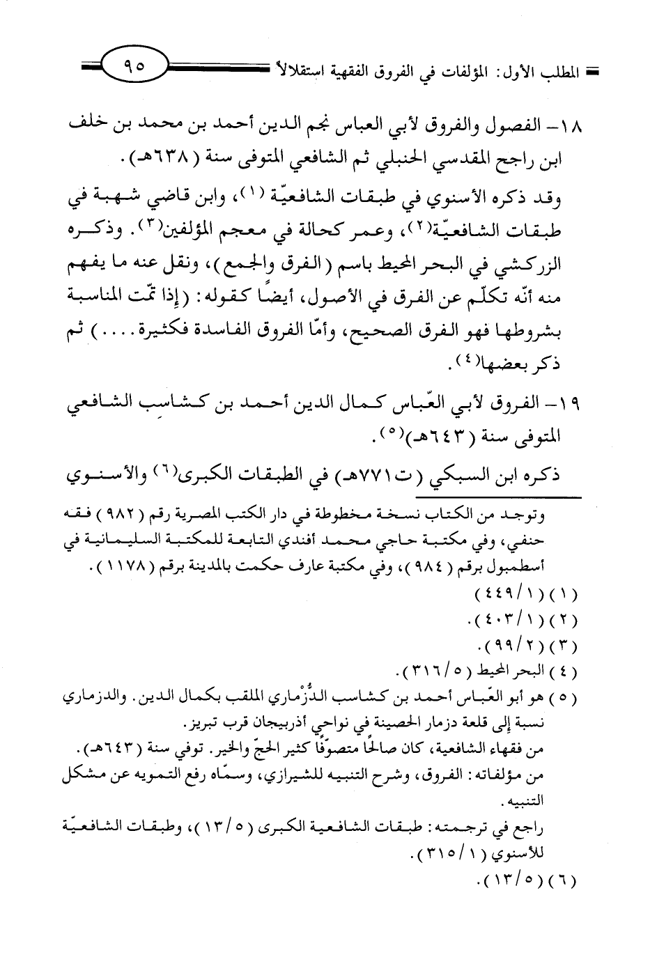 ١٨ - الفصول والفروق لأبي العباس نجم الدين أحمد بن محمد بن خلف ابن راجح المقدسي الحنبلي ثم الشافعي المتوفي سنة (٦٣٨ هـ).