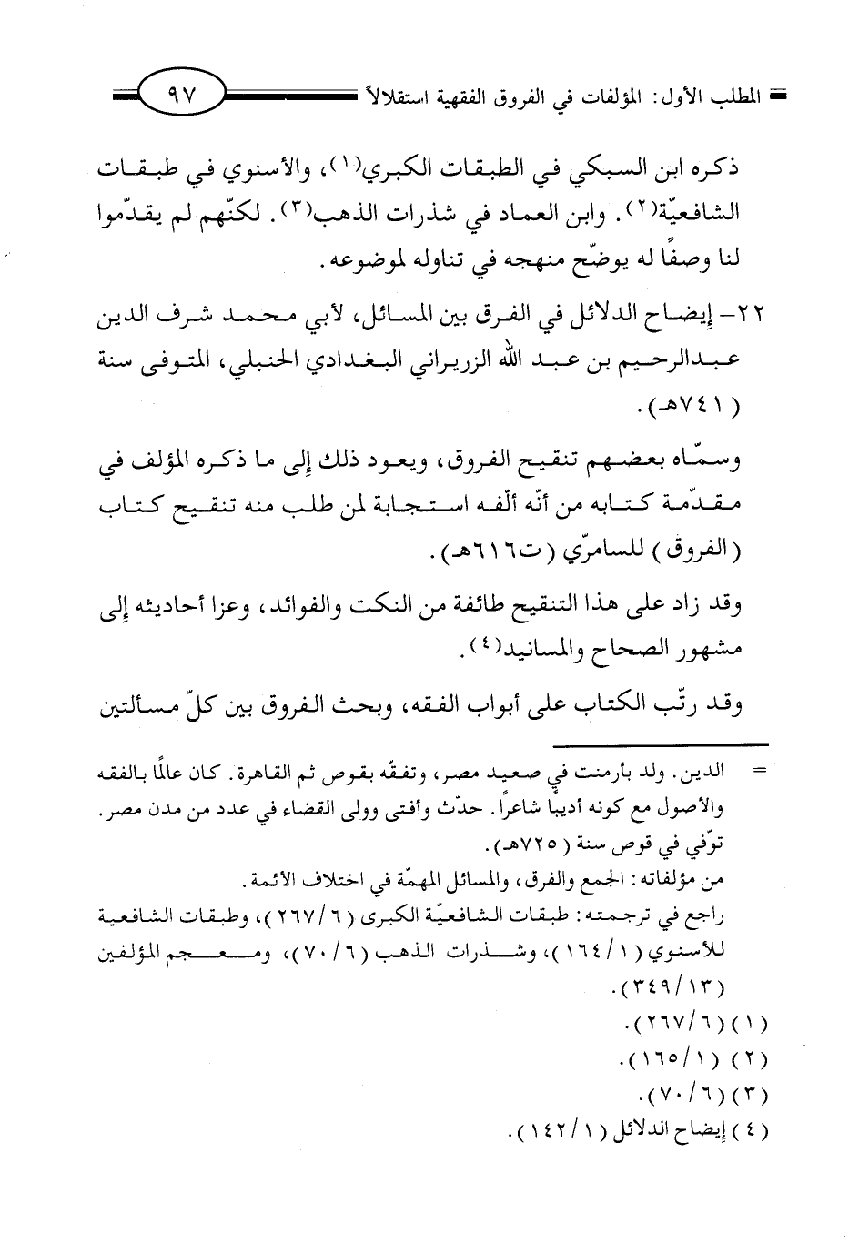 ٢٢ - إيضاح الدلائل في الفرق بين المسائل، لأبي محمد شرف الدين عبد الرحيم بن عبد الله الزريراني البغدادي الحنبلي، المتوفي سنة (٧٤١ هـ).