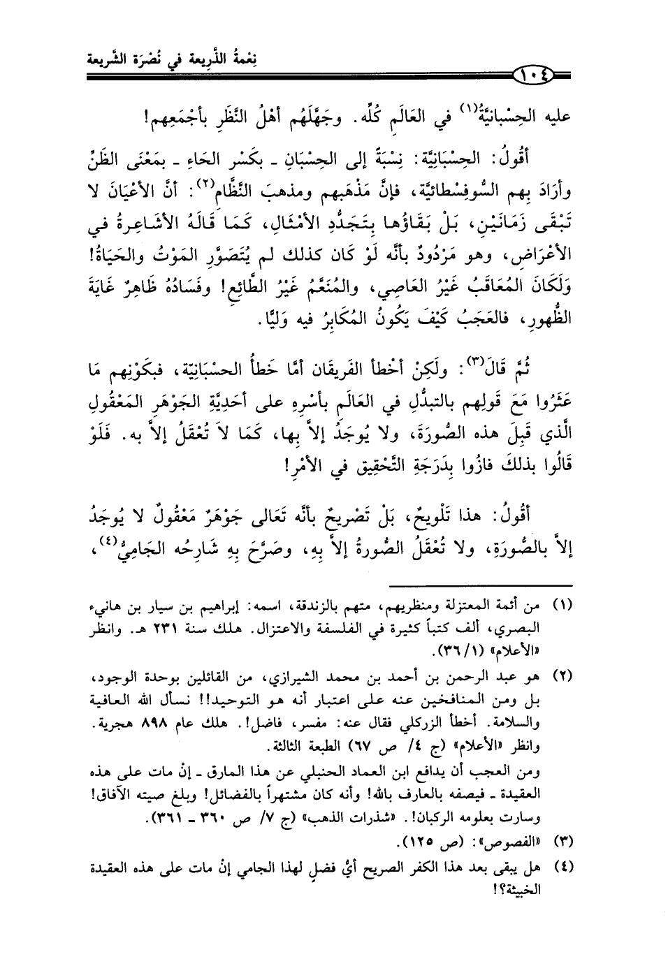 ثمَّ قَالَ وَلَكِن أَخطَأ الْفَرِيقَانِ أما خطأ الحسبانية فبكونهم مَا عثروا مَعَ قَوْلهم بالتبدل فِي الْعَالم بأسره على أحدية الْجَوْهَر الْمَعْقُول الَّذِي قبل هَذِه الصُّورَة وَلَا يُوجد إِلَّا بهَا كَمَا لَا تعقل إِلَّا بِهِ