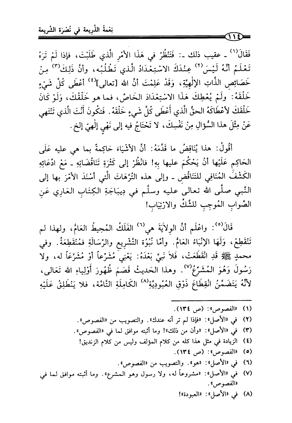 أَقُول هَذَا يُنَاقض مَا قدمه أَن الْأَشْيَاء حاكمة بِمَا هِيَ عَلَيْهِ على الْحَاكِم عَلَيْهَا أَن يحكم عَلَيْهَا بِهِ فَانْظُر إِلَى كَثْرَة تناقضاته مَعَ ادعائه الْكَشْف الْمنَافِي للتناقض وَإِلَى هَذِه الترهات الَّتِي أسْند الْأَمر بهَا إِلَى النَّبِي صلى الله عَلَيْهِ وَسلم فِي ديباجة الْكتاب العاري عَن الصَّوَاب الْمُوجب للشَّكّ والإرتياب
