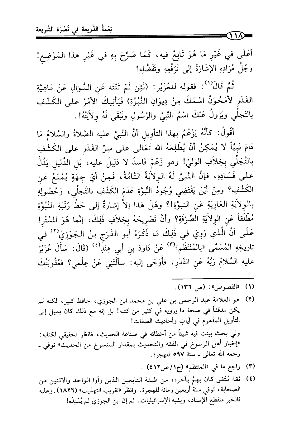 أَقُول كَأَنَّهُ يزْعم بِهَذَا التَّأْوِيل أَن النَّبِي عَلَيْهِ الصَّلَاة وَالسَّلَام مَا دَامَ نَبيا لَا يُمكن أَن يطلعه الله تَعَالَى على سر الْقدر على الْكَشْف بالتجلي بِخِلَاف الْوَلِيّ وَهُوَ زعم فَاسد لَا دَلِيل عَلَيْهِ بل الدَّلِيل يدل على فَسَاده فَإِن النَّبِي لَهُ الْولَايَة التَّامَّة فَمن أَي جِهَة يمْنَع عَن الْكَشْف وَمن أَيْن يَقْتَضِي وجود النُّبُوَّة عدم الْكَشْف بالتجلي وحصوله بِالْولَايَةِ الْعَارِية عَن النُّبُوَّة وَهل هَذَا إِلَّا إِشَارَة إِلَى حط رُتْبَة النُّبُوَّة مُطلقًا عَن الْولَايَة الصرفة وَأَن تصريحه بِخِلَاف ذَلِك إِنَّمَا هُوَ للستر على أَن الَّذِي رُوِيَ فِي ذَلِك مَا ذكره أَبُو الْفرج بن الْجَوْزِيّ فِي تَارِيخه الْمُسَمّى بالمنتظم عَن دَاوُد بن أبي هِنْد قَالَ سَأَلَ عُزَيْر عيه السَّلَام ربه عَن الْقدر فَأوحى إِلَيْهِ سَأَلتنِي عَن علمي فعقوبتك