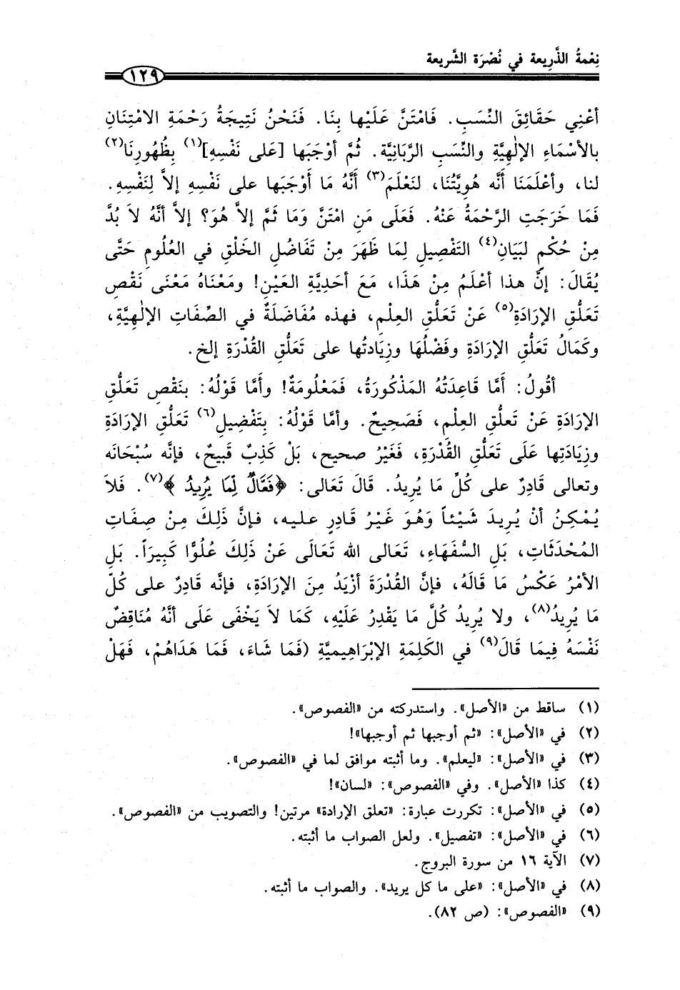بل الْأَمر عكس مَا قَالَه فَإِن الْقُدْرَة أَزِيد من الْإِرَادَة فَإِنَّهُ قَادر على كل مَا يُرِيد وَلَا يُرِيد كل مَا يقدر عَلَيْهِ كَمَا لَا يخفى على أَنه مناتقض نَفسه فِيمَا قَالَ فِي الْكَلِمَة الإبراهيمية فَمَا شَاءَ فَمَا هدَاهُم فَهَل