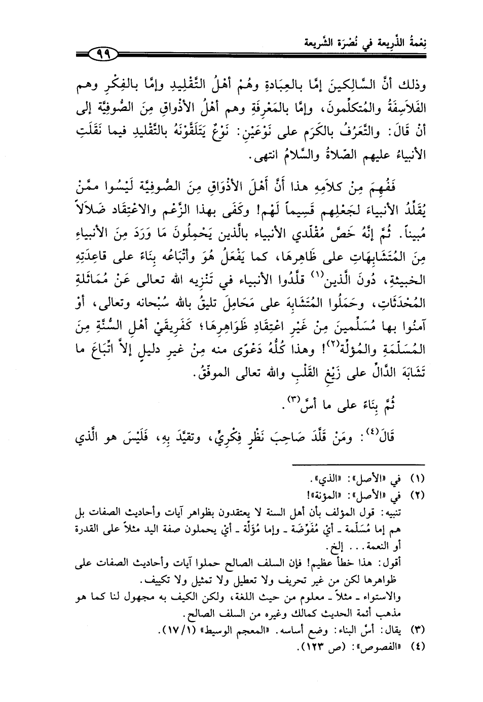 ثمَّ إِنَّه خص مقلدي الْأَنْبِيَاء بالذين يحملون مَا ورد من الْأَنْبِيَاء من المتشابهات على ظَاهرهَا كَمَا يفعل هُوَ وَأَتْبَاعه بِنَاء على قَاعِدَته الخبيثة دون الَّذين قلدوا الْأَنْبِيَاء فِي تَنْزِيه الله تَعَالَى عَن مماثلة المحدثات وحملوا الْمُتَشَابه على محامل تلِيق بِاللَّه سُبْحَانَهُ وَتَعَالَى أَو آمنُوا بهَا مُسلمين من غير اعْتِقَاد ظواهرها كفريقي أهل السّنة من الْمسلمَة والمؤلة وَهَذَا كُله دَعْوَى مِنْهُ من غير دَلِيل إِلَّا اتِّبَاع مَا تشابه الدَّال على زيغ الْقلب وَالله تَعَالَى الْمُوفق