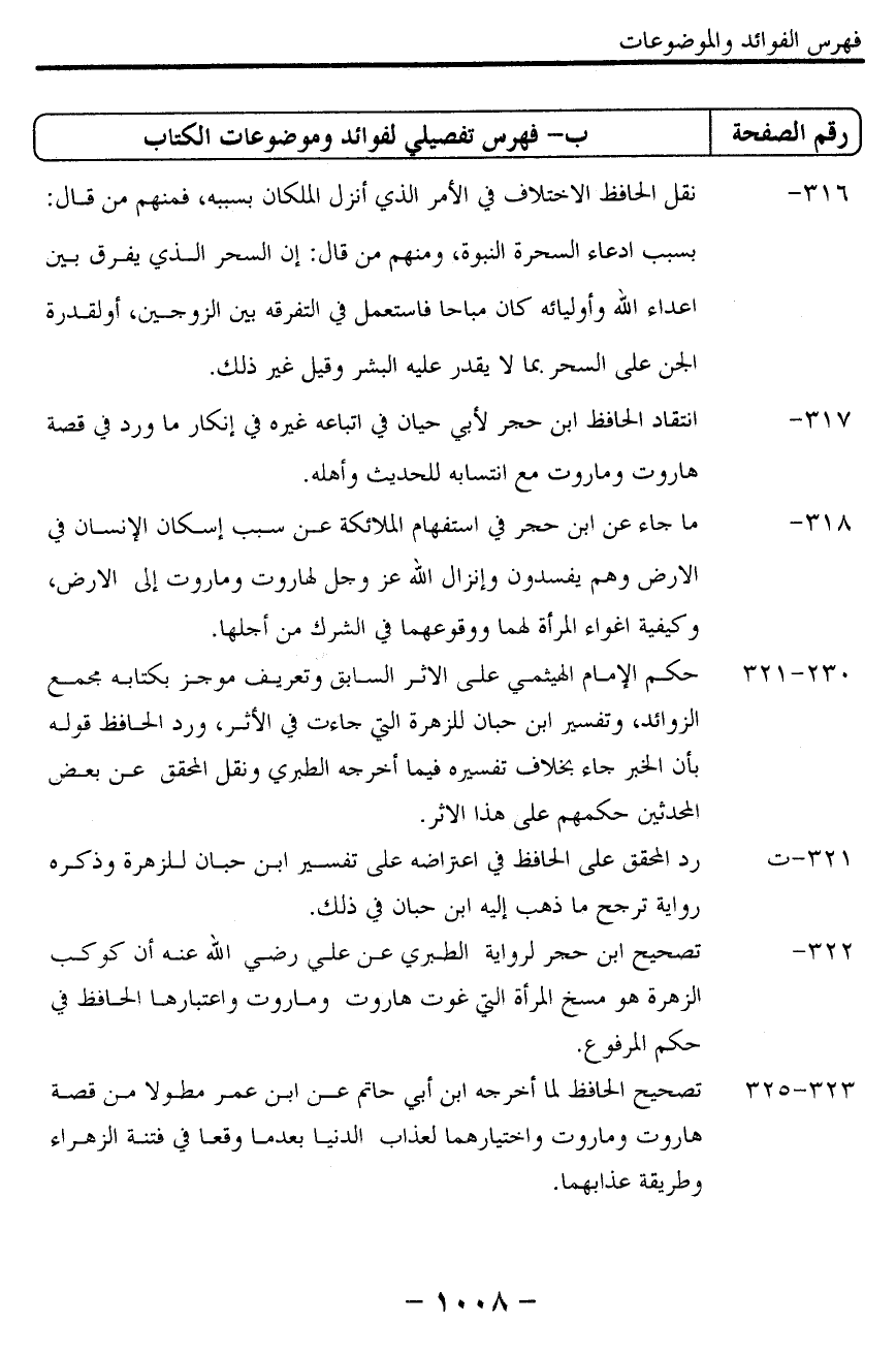 323-325 تصحيح الحافظ لما أخرجه ابن أبي حاتم عن ابن عمرو مطولًا من قصة هاروت وماروت واختيارهما لعذاب الدنيا بعدما وقعا في فتنة الزهراء وطريقة عذابهما.
