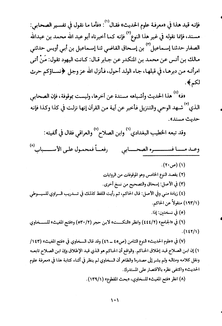 فإنه قيد هذا في "معرفة علوم الحديث" فقال1: "فأما ما نقول في تفسير الصحابي: مسند، فإنما نقوله في غير هذا النوع2 فإنه كما أخبرناه أبو عبد الله محمد بن عبد الله الصفار حدثنا إسماعيل3 بن إسحاق القاضي ثنا إسماعيل بن أبي أويس حدثني مالك بن أنس عن محمد بن المنكدر عن جابر قال: كانت اليهود تقول: مَنْ أتى امرأته من دبرها. في قبلها، جاء الولد أحول، فأنزل الله عز وجل {نِسَاؤُكُمْ حَرْثٌ لَكُم} .