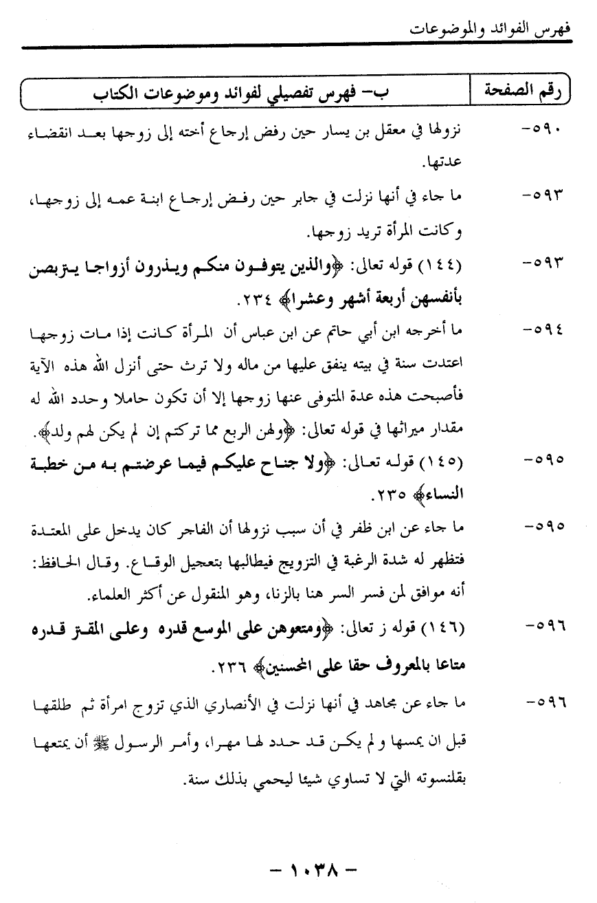 593- "144" قوله تعالى: {وَالَّذِينَ يُتَوَفَّوْنَ مِنْكُمْ وَيَذَرُونَ أَزْوَاجًا يَتَرَبَّصْنَ بِأَنْفُسِهِنَّ أَرْبَعَةَ أَشْهُرٍ وَعَشْرًا} 234.