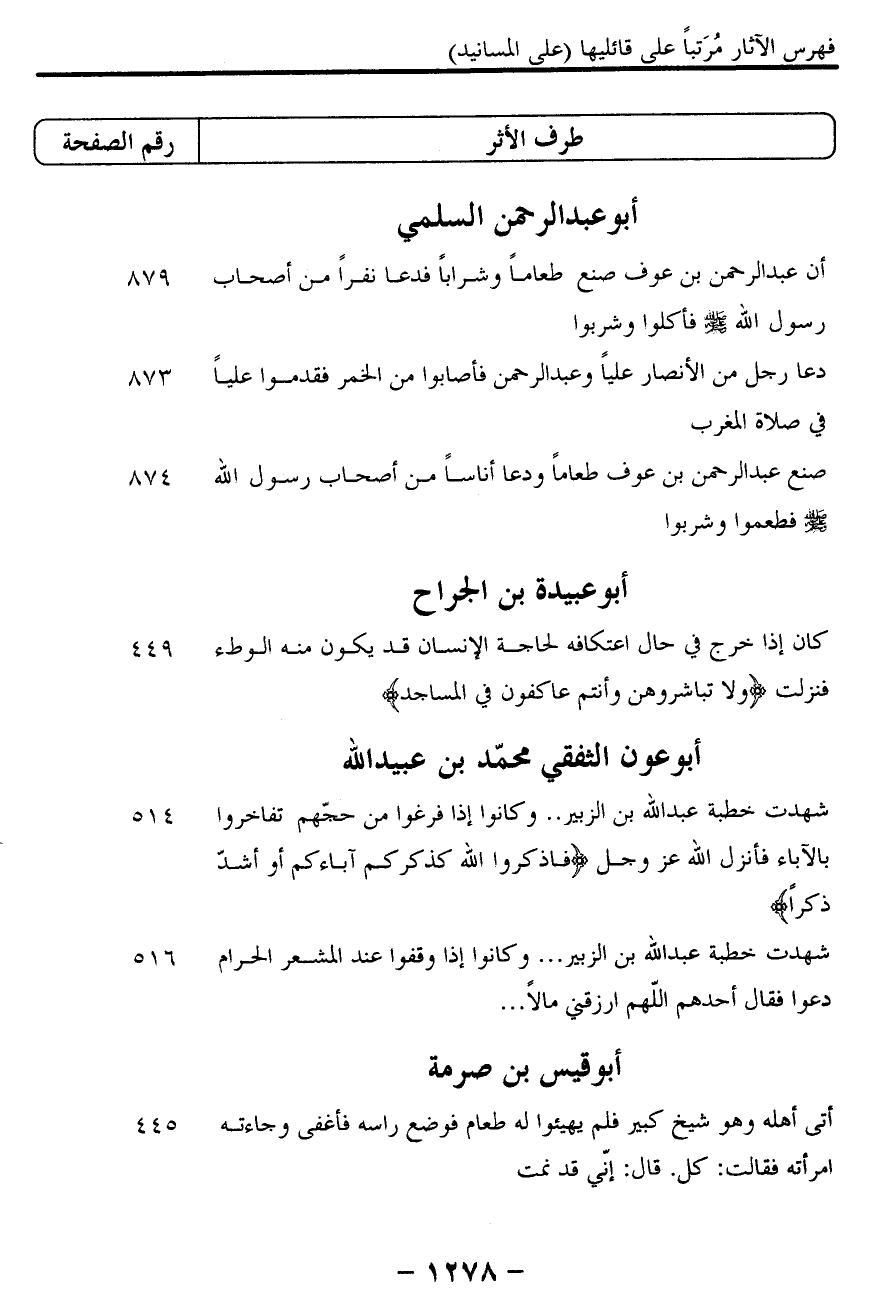 أن عبد الرحمن بن عوف صنع طعاما وشرابا فدعا نفرا من أصحاب رسول الله صلى الله عليه وسلم فأكلوا وشربوا 879
