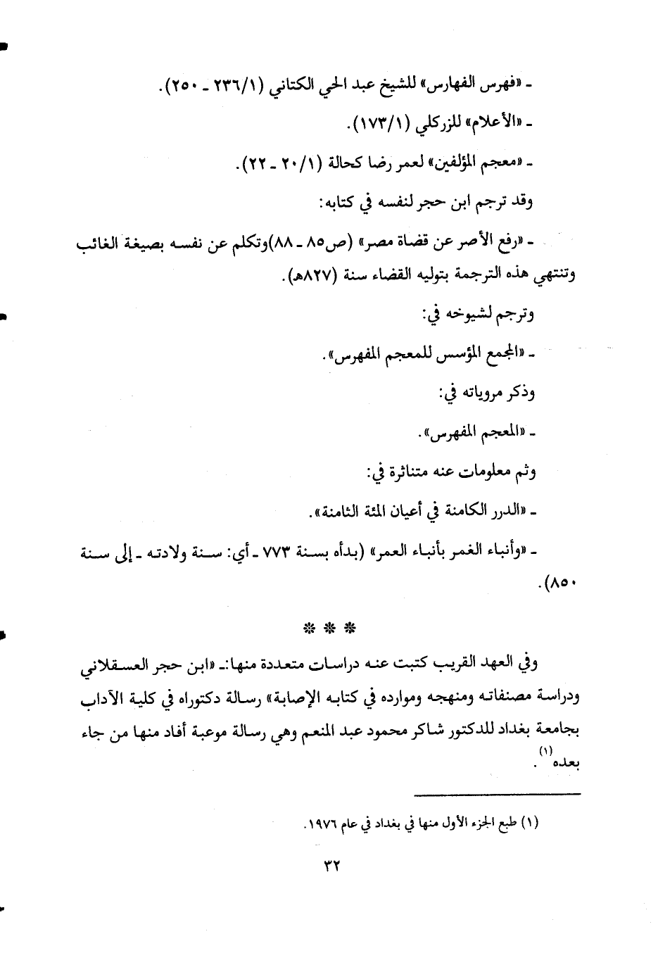 - "ابن حجر العسقلاني ودراسة مصنفاته ومنهجه وموارده في كتاب الإصابة" رسالة دكتواره في كلية الآداب بجامعة بغداد للدكتور شاكر محمود عبد المنعم وهي رسالة موعبة أفاد منها من جاء بعده1.