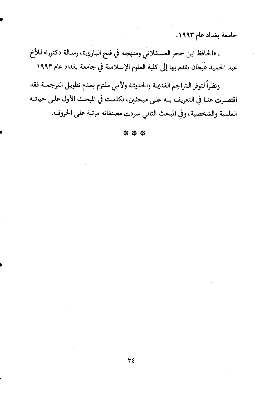 - "الحافظ ابن حجر العسقلاني ومنهجه في فتح الباري" رسالة دكتوراه للأخ عبد الحميد عبطان تقدم بها إلى كلية العلوم الإسلامية في جامعة بغداد عام 1993.