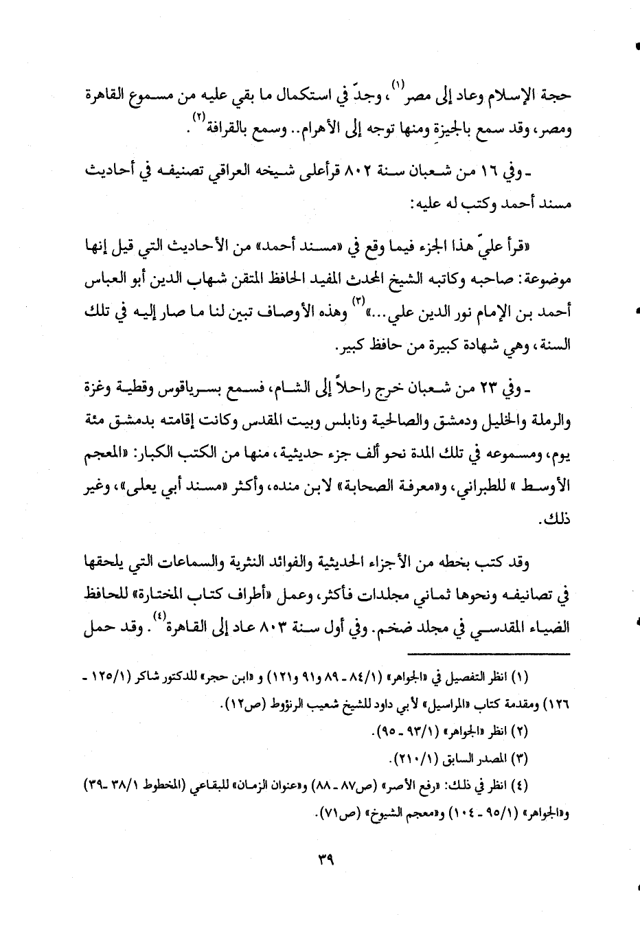 - وفي 16 من شعبان سنة 802 قرأ على شيخه العراقي تصنيفه في أحاديث مسند أحمد وكتب له عليه: