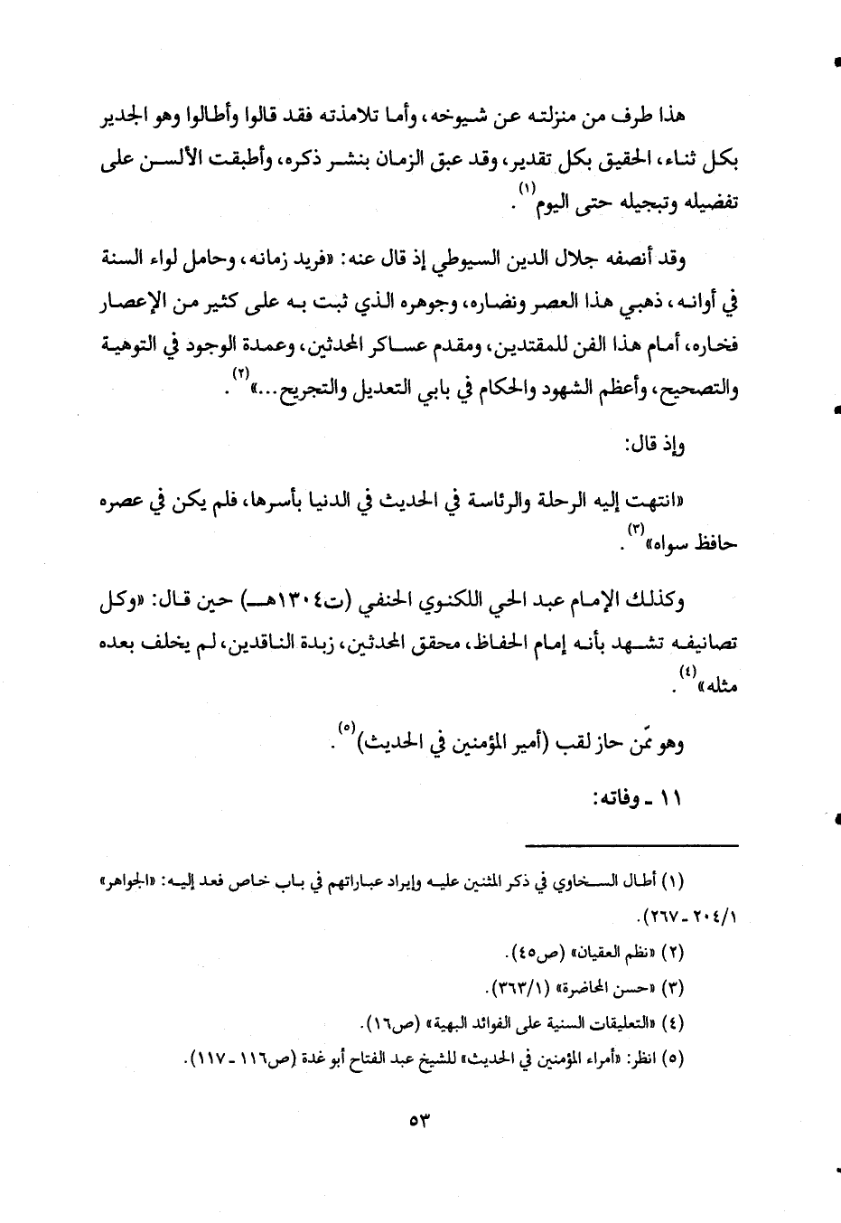 وكذلك الإمام عبد الحي اللكنوي الحنفي "ت1304هـ" حين قال: "وكل تصانيفه تشهد بأنه إمام الحفاظ، محقق المحدثين، زبدة الناقدين، لم يخلف بعده مثله"4.