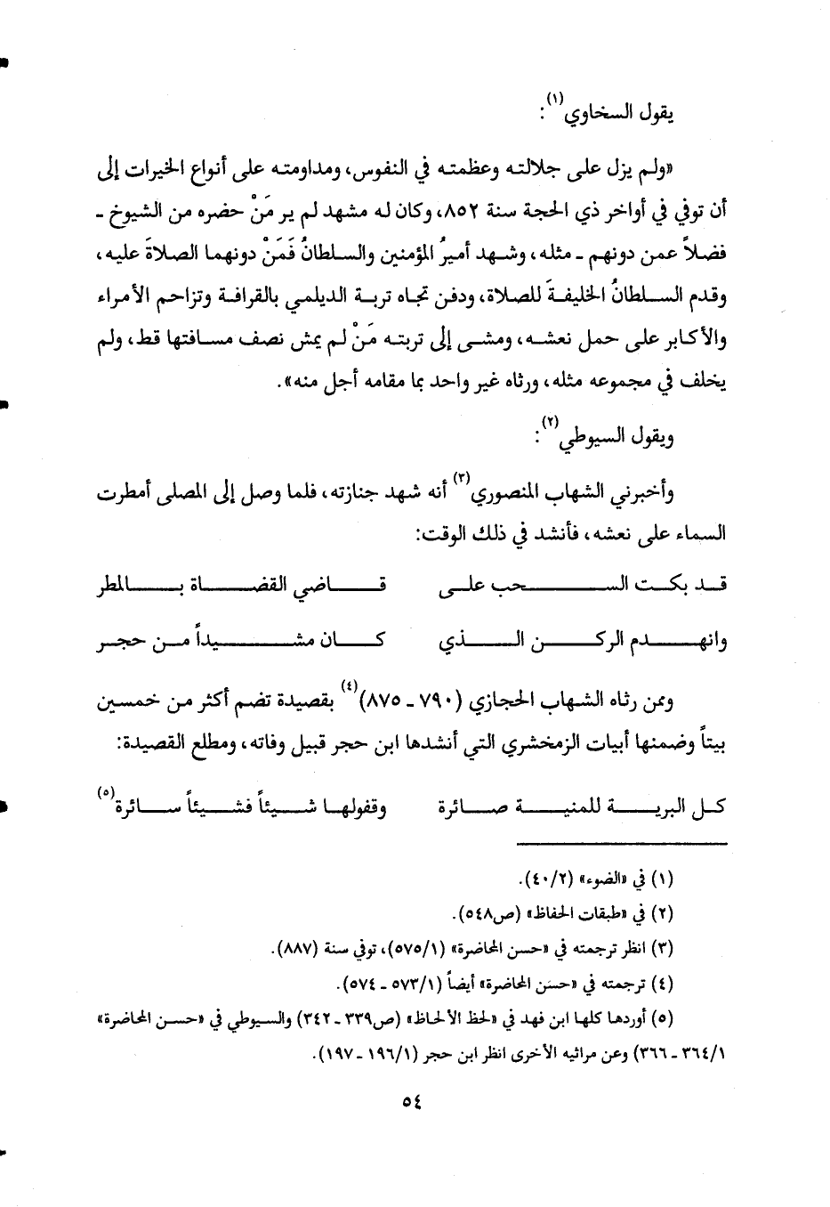 5 أوردها كلها ابن فهد في "لحظ الألحاظ" "ص339-342" والسيوطي في "حسن المحاضرة" 1/ 364-366" وعن مراثيه الأخرى انظر ابن حجر "1/ 196-197".