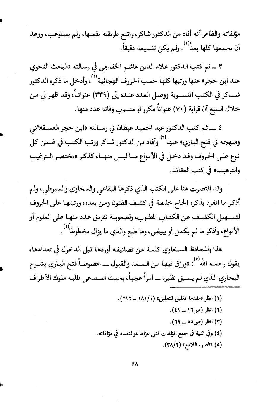 4- ثم كتب الدكتور عبد الحميد عبطان في رسالته "ابن حجر العسقلاني ومنهجه في فتح الباري" عنها3 وأفاد من الدكتور شاكر ورتب الكتب في ضمن كل نوع على الحروف وقد دخل في الأنواع ما ليس منها، كذكر "مختصر الترغيب والترهيب" في كتب العقائد.