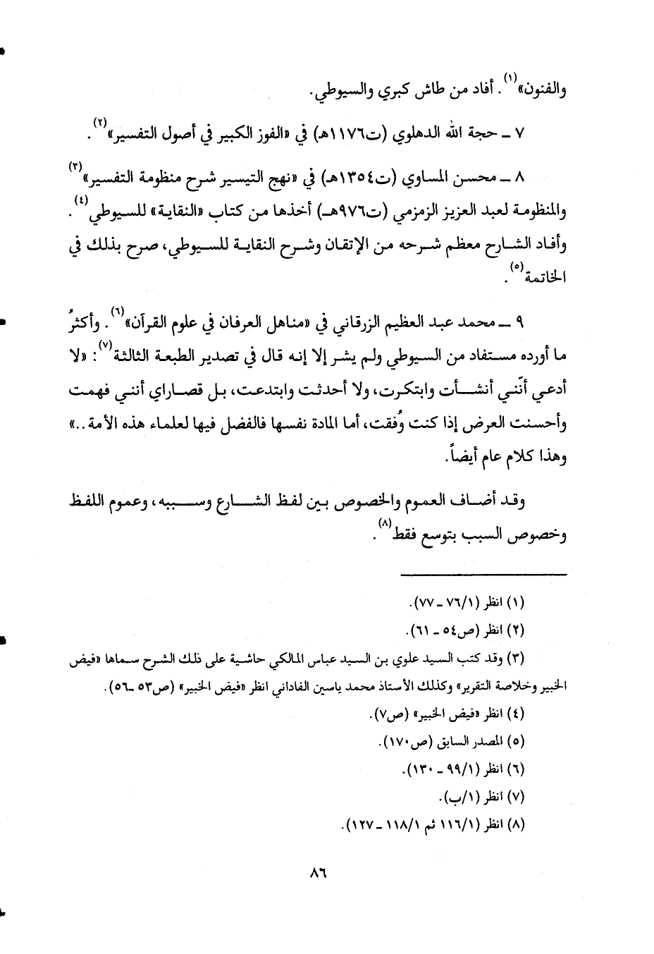 9- محمد عبد العظيم الزرقاني في "مناهل العرفان في علوم القرآن"6. وأكثر ما أورده مستفاد من السيوطي ولم يشر إلا أنه قال في تصدير الطبعة الثالثة7: "لا أدعي أنني أنشأت وابتكرت، ولا أحدثت وابتدعت، بل قصاراي أنني فهمت وأحسنت العرض إذا كنت وُفقت، أما المادة نفسها فالفضل فيها لعلماء هذه الأمة.." وهذا كلام عام أيضًا.