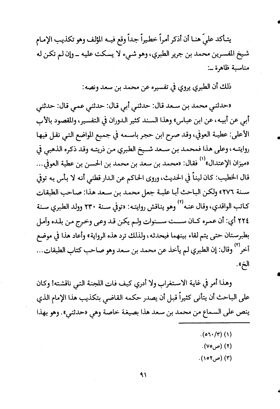 "حدثني محمد بن سعد قال: حدثني أبي قال: حدثني عمي قال: حدثني أبي عن أبيه، عن ابن عباس" وهذا السند كثير الدوران في التفسير، والمقصود بالأب الأعلى: عطية العوفي، وقد صرح ابن حجر باسمه في جميع المواضع التي نقل فيها روايته، وعلى هذا فمحمد بن سعد شيخ الطبري من ذريته وقد ذكره الذهبي في "ميزان الاعتدال"1 فقال: "محمد بن سعد بن محمد بن الحسن بن عطية العوفي ... قال الخطيب: كان لينًا في الحديث، وروى الحاكم عن الدارقطني أنه لا بأس به توفي سنة 276" ولكن الباحث أبا علبة جعل محمد بن سعد هذا: صاحب الطبقات كاتب الواقدي، وقال عنه2 وهو يناقش روايته: "توفي سنة 230 وولد الطبري سنة 224 أي: أن عمره كان ست سنوات ولم يكن قد وعي وخرج من بلده وآمل بطبرستان حتى يتم لقاء بينهما فيحدثه، ولذلك ترد هذه الرواية" وأعاد هذا في موضع آخر3 وقال: إن الطبري لم يأخذ عن محمد بن سعد وهو صاحب كتاب الطبقات ... إلخ".