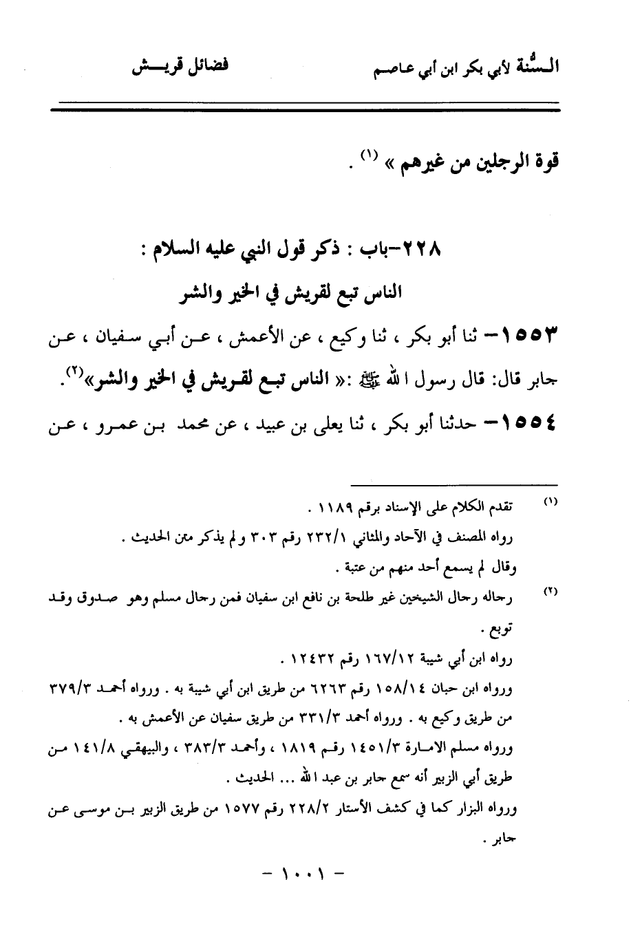 1553 - حَدَّثنا أَبُو بَكْرٍ، حَدَّثنا وَكِيعٌ، عَنِ الأَعْمَشِ، عَنْ أَبِي سُفْيَانَ، عَنْ جَابِرٍ، قَالَ: قَالَ رَسُولُ اللهِ صَلى الله عَلَيهِ وسَلمَ: النَّاسُ تَبَعٌ لِقُرَيْشٍ فِي الْخَيْرِ وَالشَّرِّ.