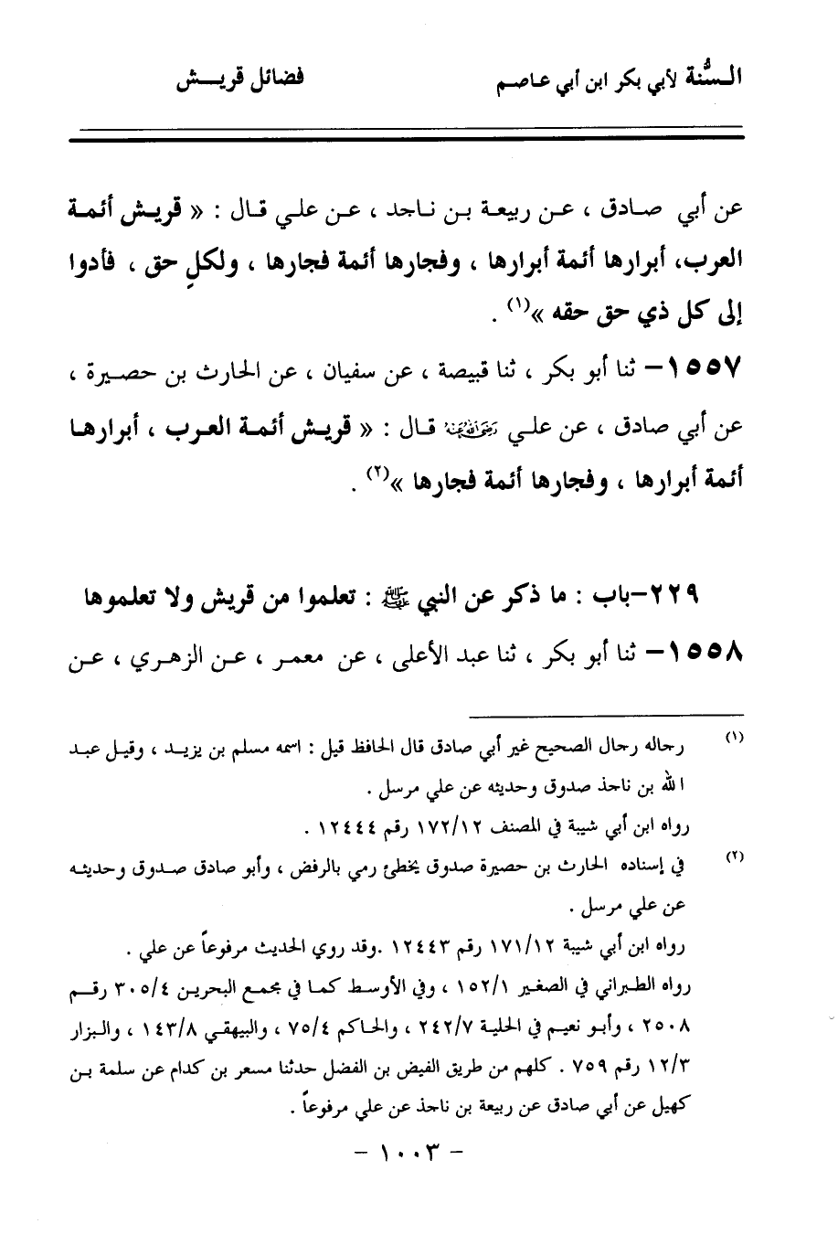 1557 - حَدَّثنا أَبُو بَكْرٍ، حَدَّثنا قَبِيصَةُ، عَنْ سُفْيَانَ، عَنِ الْحَارِثِ بْنِ حَصِيرَةَ، عَنْ أَبِي صَادِقٍ، عَنْ عَلِيٍّ رَضِيَ اللهُ عَنْهُ، قَالَ: قُرَيْشٌ أَئِمَّةُ الْعَرَبِ: أَبْرَارُهَا أَئِمَّةُ أَبْرَارِهَا، وَ فُجَّارُهَا أَئِمَّةُ فُجَّارِهَا.
