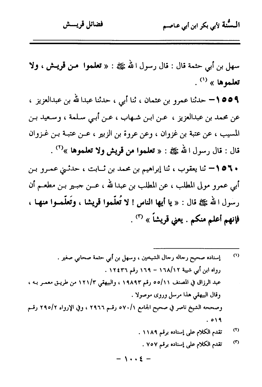 1559 - حَدَّثنا عَمْرُو بْنُ عُثْمَانَ، حَدَّثنا أَبِي، حَدَّثنا عَبْدُ اللهِ بْنُ عَبْدِ الْعَزِيزِ، عَنْ مُحَمَّدِ بْنِ عَبْدِ الْعَزِيزِ، عَنِ ابْنِ شِهَابٍ، عَنْ أَبِي سَلَمَةَ، وَسَعِيدِ بْنِ الْمُسَيِّبِ، عَنْ عُتْبَةَ بْنِ غَزْوَانَ، وَعَنْ عُرْوَةَ بْنِ الزُّبَيْرِ، عَنْ عُتْبَةَ بْنِ غَزْوَانَ، قَالَ: قَالَ رَسُولُ اللهِ صَلى الله عَلَيهِ وسَلمَ: تَعَلَّمُوا مِنْ قُرَيْشٍ وَلاَ تُعَلِّمُوهَا.