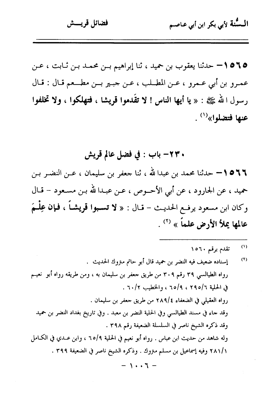 1566 - حَدَّثنا مُحَمَّدُ بْنُ عَبْدِ اللهِ، حَدَّثنا جَعْفَرُ بْنُ سُلَيْمَانَ، عَنِ النَّضْرِ بْنِ حُمَيْدٍ، عَنِ الْجَارُودِ، عَنْ أَبِي الأَحْوَصِ، عَنْ عَبْدِ اللهِ بْنِ مَسْعُودٍ, قَالَ: وَكَانَ ابْنُ مَسْعُودٍ يَرْفَعُ الْحَدِيثَ, قَالَ: لاَ تَسُبُّوا قُرَيْشًا، فَإِنَّ عِلْمَ عَالِمِهَا يَمْلأُ الأَرْضَ عِلْمًا.