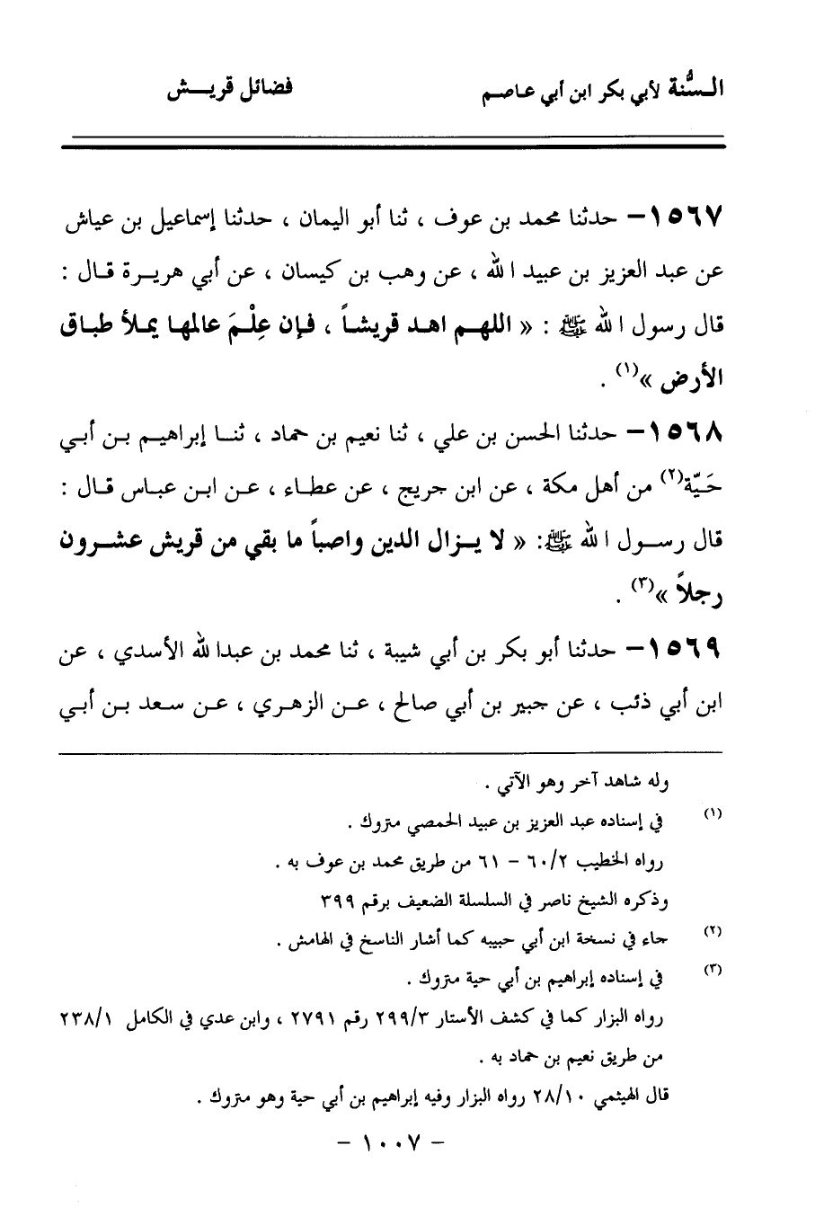 1568 - حَدَّثنا الْحَسَنُ بْنُ عَلِيٍّ، حَدَّثنا نُعَيْمُ بْنُ حَمَّادِ, حدثنا إبراهيم بْنِ أَبِي حَيّه، مِنْ أَهْلِ مَكَّةَ، عَنْ ابْنِ جُرَيْجٍ، عَنْ عَطَاءٍ، عَنْ ابْنِ عَبَّاسٍ، قَالَ: قَالَ رَسُولُ اللهِ صَلى الله عَلَيهِ وسَلمَ: لاَ يَزَالُ الدِّينُ وَاصِبًا مَا بَقِيَ مِنْ قُرَيْشٍ عِشْرُونَ رَجُلاً.