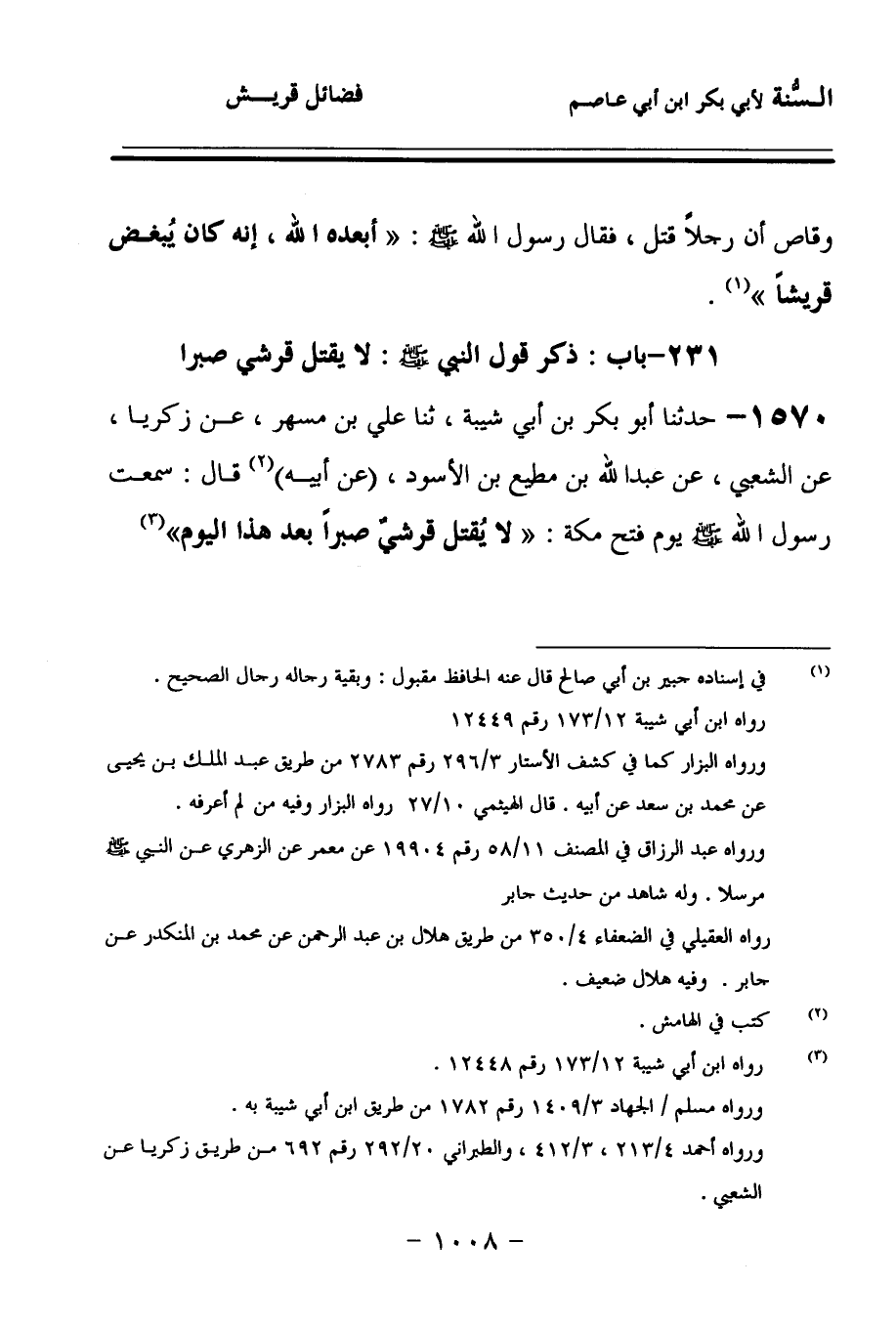1570 - حَدَّثنا أَبُو بَكْرِ بْنُ أَبِي شَيْبَةَ، حَدَّثنا عَلِيُّ بْنُ مُسْهِرٍ، عَنْ زَكَرِيَّا, عَنِ الشَّعْبِيِّ، عَنْ عَبْدِ اللهِ بْنِ مُطِيعِ بْنِ الأَسْوَدِ، عَنْ أَبِيهِ، قَالَ: سَمِعْتُ رَسُولَ اللهِ صَلى الله عَلَيهِ وسَلمَ يَوْمَ فَتْحِ مَكَّةَ: لاَ يُقْتَلُ قُرَشِيٌّ صَبْرًا بَعْدَ هَذَا الْيَوْمِ.