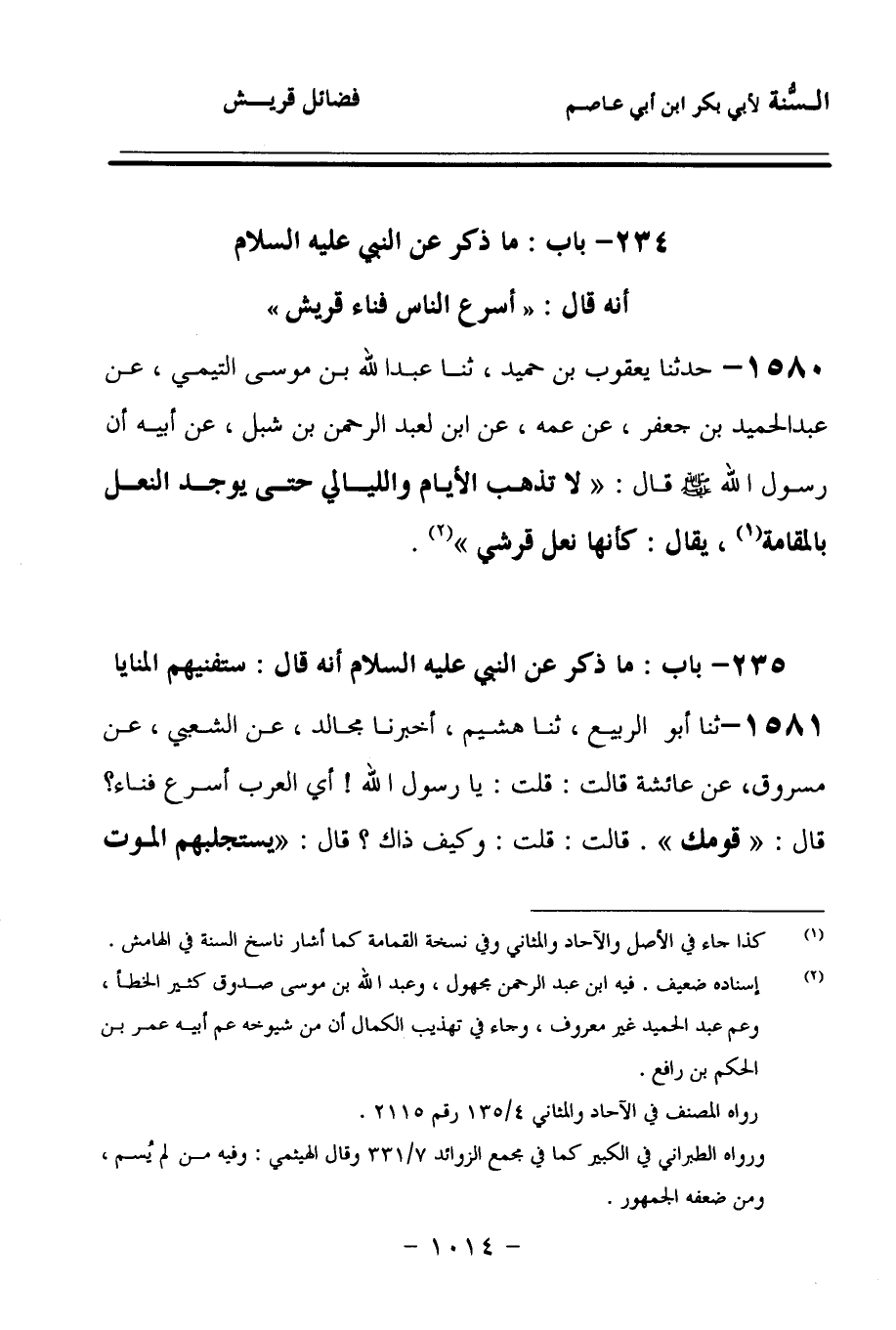 234 - بَابُ مَا ذُكِرَ عَنِ النَّبِيِّ عَلَيْهِ السَّلاَمُ أَنَّهُ قَالَ: أَسْرَعُ النَّاسِ فَنَاءً قُرَيْشٌ.
