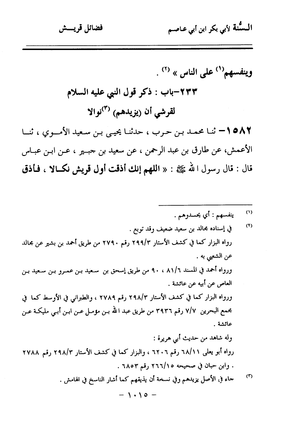 1582 - حَدَّثنا مُحَمَّدُ بْنُ حَرْبٍ، حَدَّثنا يَحْيَى بْنُ سَعِيدٍ الأُمَوِيُّ، حَدَّثنا الأَعْمَشُ، عَنْ طَارِقِ بْنِ عَبْدِ الرَّحْمَنِ، عَنْ سَعِيدِ بْنِ جُبَيْرٍ، عَنِ ابْنِ عَبَّاسٍ، قَالَ: قَالَ رَسُولُ اللهِ صَلى الله عَلَيهِ وسَلمَ: اللهُمَّ إِنَّكَ أَذَقْتَ أَوَّلَ قُرَيْشٍ نَكَالاً، فَأَذِقْ آخِرَهُمْ نَوَالاً.