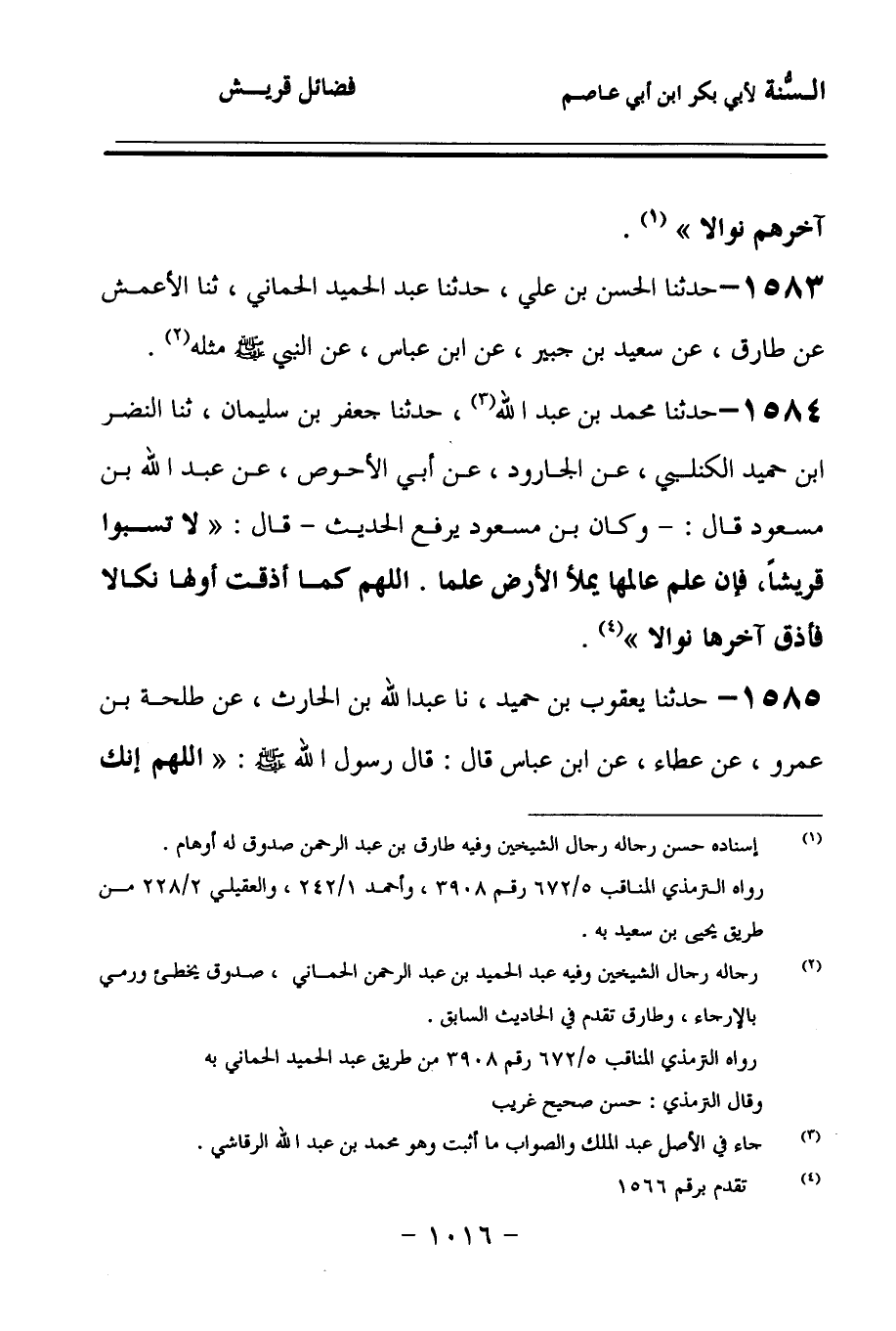 1584 - حَدَّثنا مُحَمَّدُ بْنُ عَبْدِ الله، حَدَّثنا جَعْفَرُ بْنُ سُلَيْمَانَ، حَدَّثنا النَّضْرُ بْنُ حُمَيْدٍ الْكِنْدِيُّ، عَنِ الْجَارُودِ، عَنْ أَبِي الأَحْوَصِ، عَنْ عَبْدِ اللهِ بْنِ مَسْعُودٍ قَالَ: وَكَانَ ابْنُ مَسْعُودٍ يَرْفَعُ الْحَدِيثَ قَالَ: لاَ تَسُبُّوا قُرَيْشًا، فَإِنَّ عِلْمَ عَالِمِهَا يَمْلأُ الأَرْضَ عِلْمًا، اللهُمَّ كَمَا أَذَقْتَ أَوَّلَهَا نَكَالاً، فَأَذِقْ آخِرَهَا نَوَالاً.