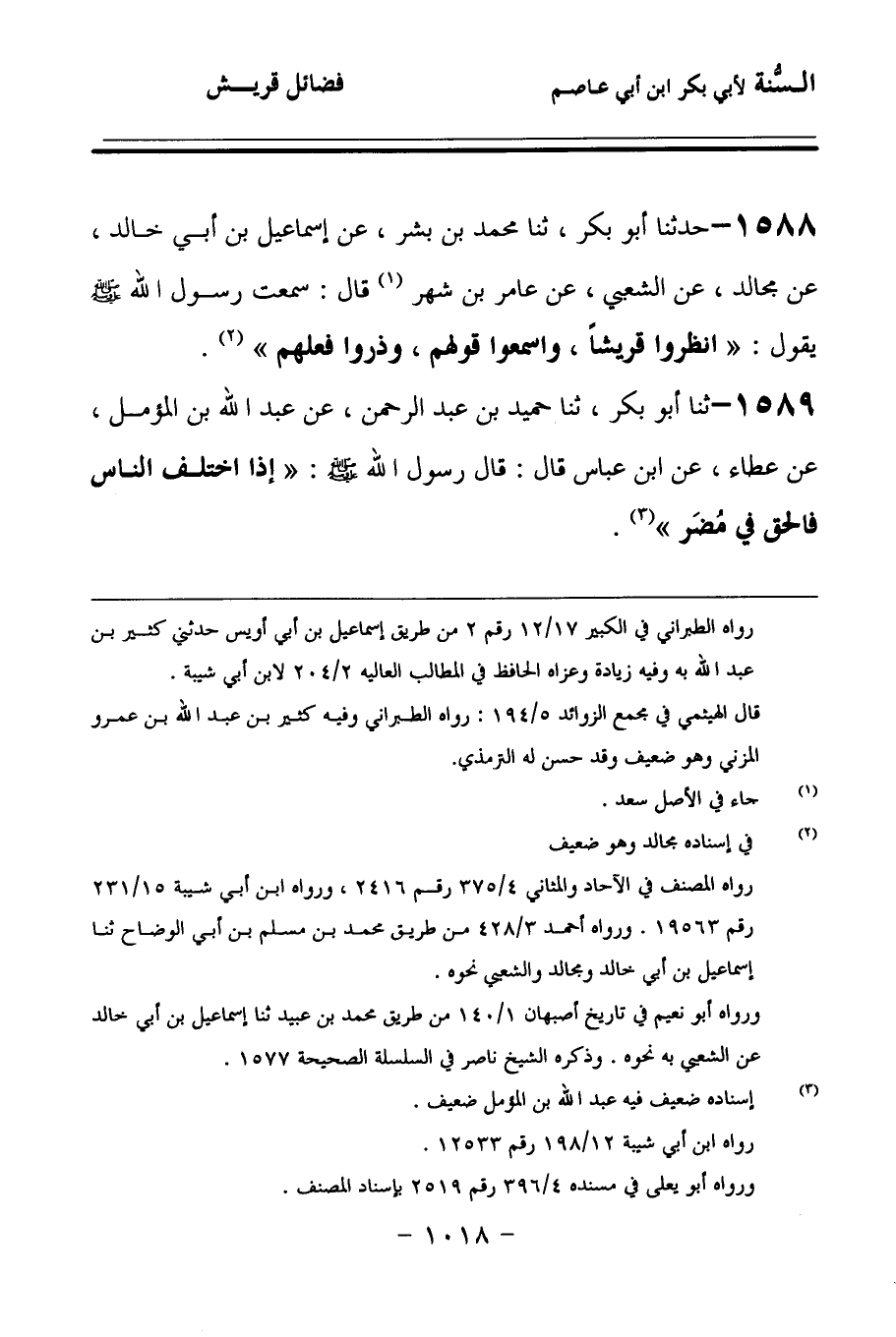 1588 - حَدَّثنا أَبُو بَكْرٍ، حَدَّثنا مُحَمَّدُ بْنُ بِشْرٍ، عَنْ إِسْمَاعِيلَ بْنِ أَبِي خَالِدٍ، عَنْ مُجَالِدٍ، عَنِ الشَّعْبِيِّ، عَنْ عَامِرِ بْنِ شَهْرٍ، قَالَ: سَمِعْتُ رَسُولَ اللهِ صَلى الله عَلَيهِ وسَلمَ يَقُولُ: انْظُرُوا قُرَيْشًا، وَاسْمَعُوا قَوْلَهُمْ، وَذَرُوا فِعْلَهُمْ.