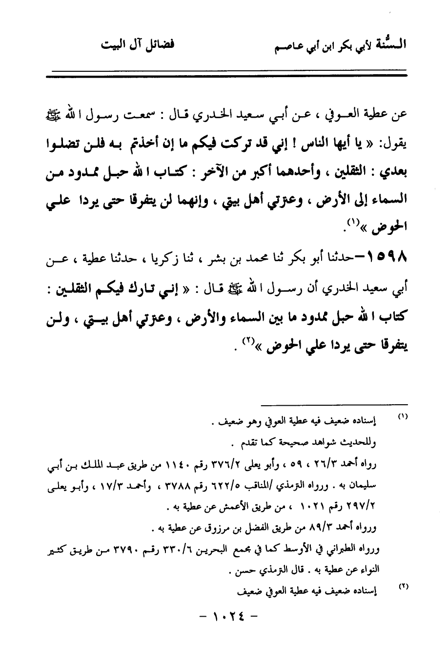 1598 - حَدَّثنا أَبُو بَكْرٍ، حَدَّثنا مُحَمَّدُ بْنُ بِشْرٍ، حَدَّثنا زَكَرِيَّا، حَدَّثنا عَطِيَّةُ، عَنْ أَبِي سَعِيدٍ الْخُدْرِيِّ، أَنَّ رَسُولَ اللهِ صَلى الله عَلَيهِ وسَلمَ قَالَ: إِنِّي تَارِكٌ فِيكُمُ الثَّقَلَيْنِ: كِتَابَ اللهِ، حَبْلٌ مَمْدُودٌ مَا بَيْنَ السَّمَاءِ وَالأَرْضِ، وَعِتْرَتِي أَهْلَ بَيْتِي، وَلَنْ يَتَفَرَّقَا, حَتَّى يَرِدَا عَلَيَّ الْحَوْضَ.